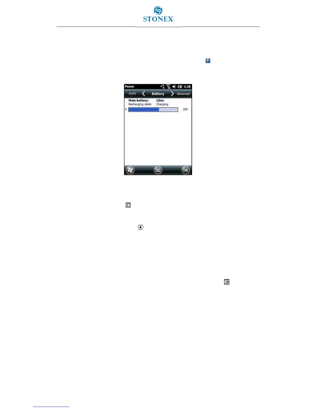 STONEX recommends that you recharge the battery when any of these indicators appear.