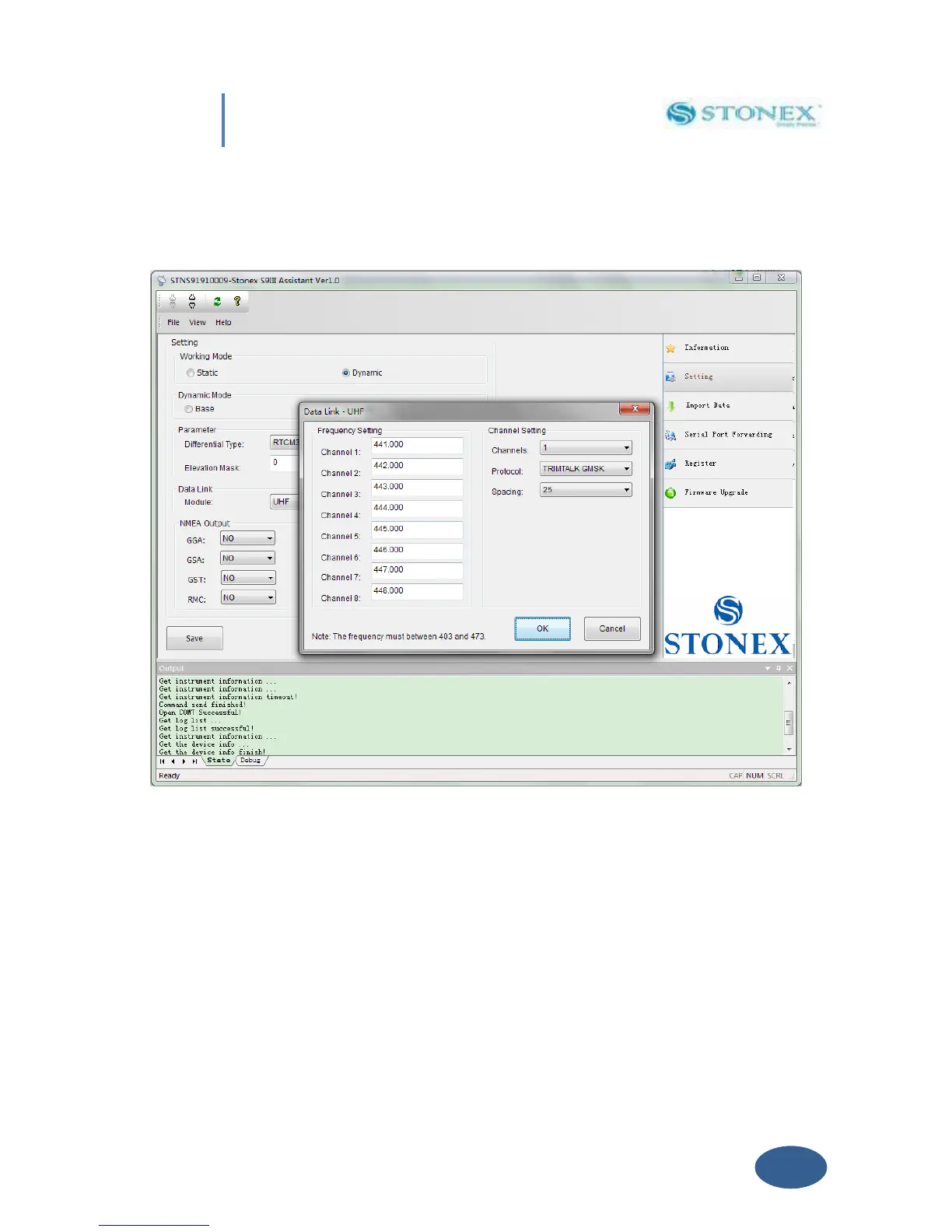data : Frequency settings , Station name , Channel number , Protocol and Channel Spacing .
