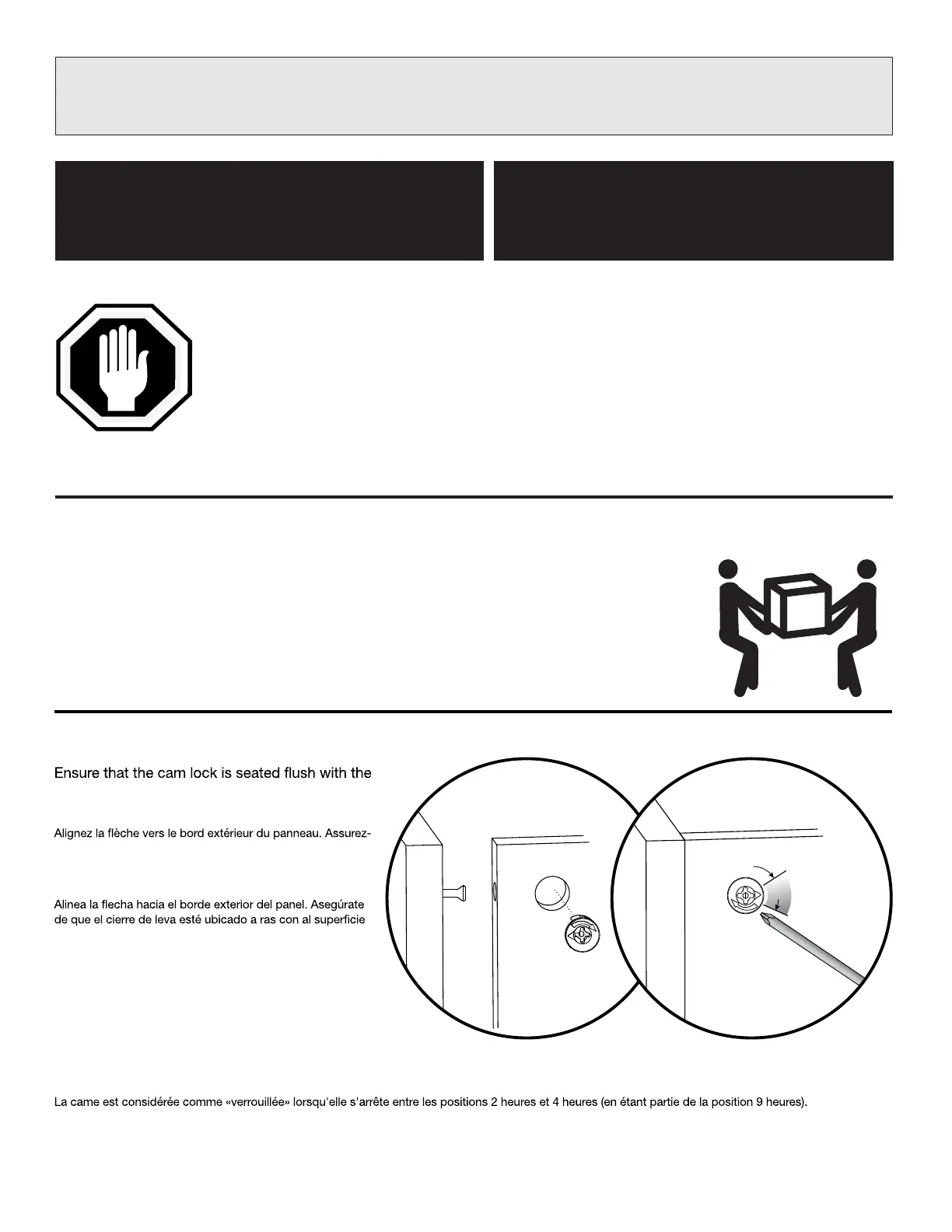 SERRER LES VERROUILLAGES À CAME. Une fois que les panneaux sont joints, tournez le verrouillage à came jusqu'à ce qu'il s'arrête.