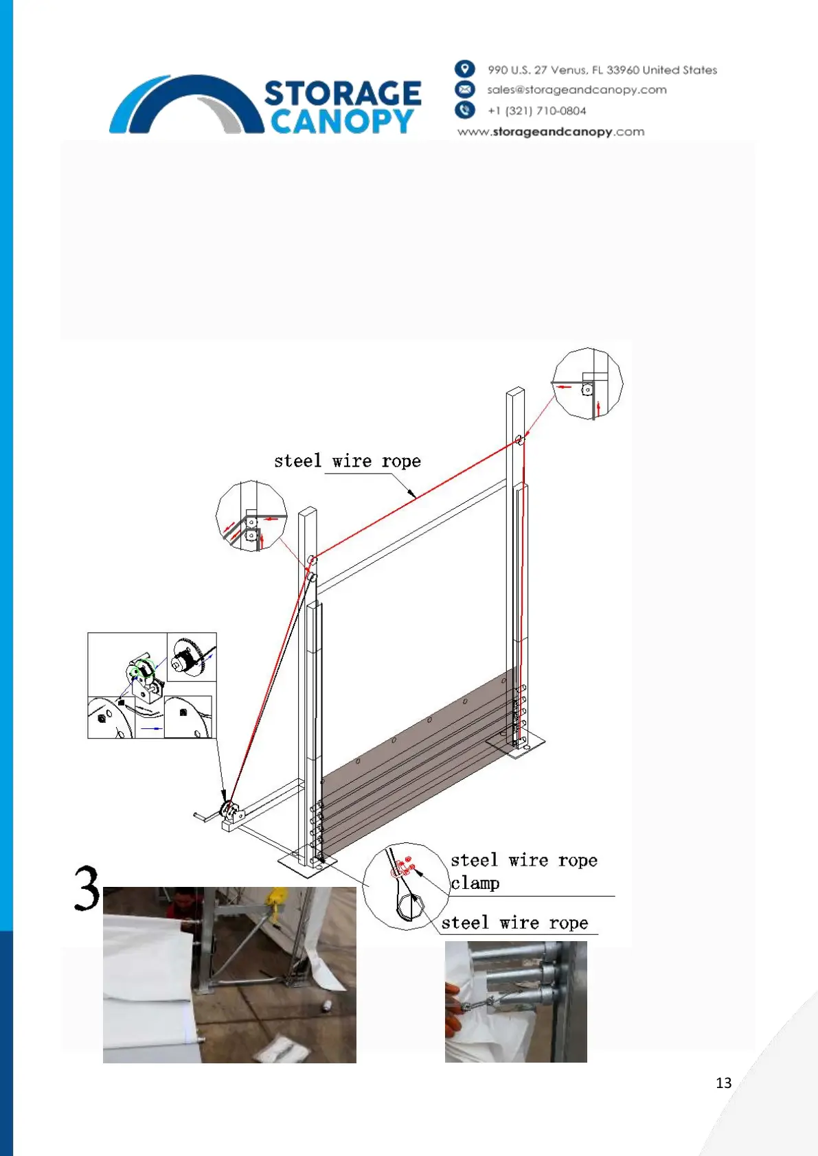 7. Fix each end of steel wire rope to the hole on bottom bracing tube with steel wire clamps. Make