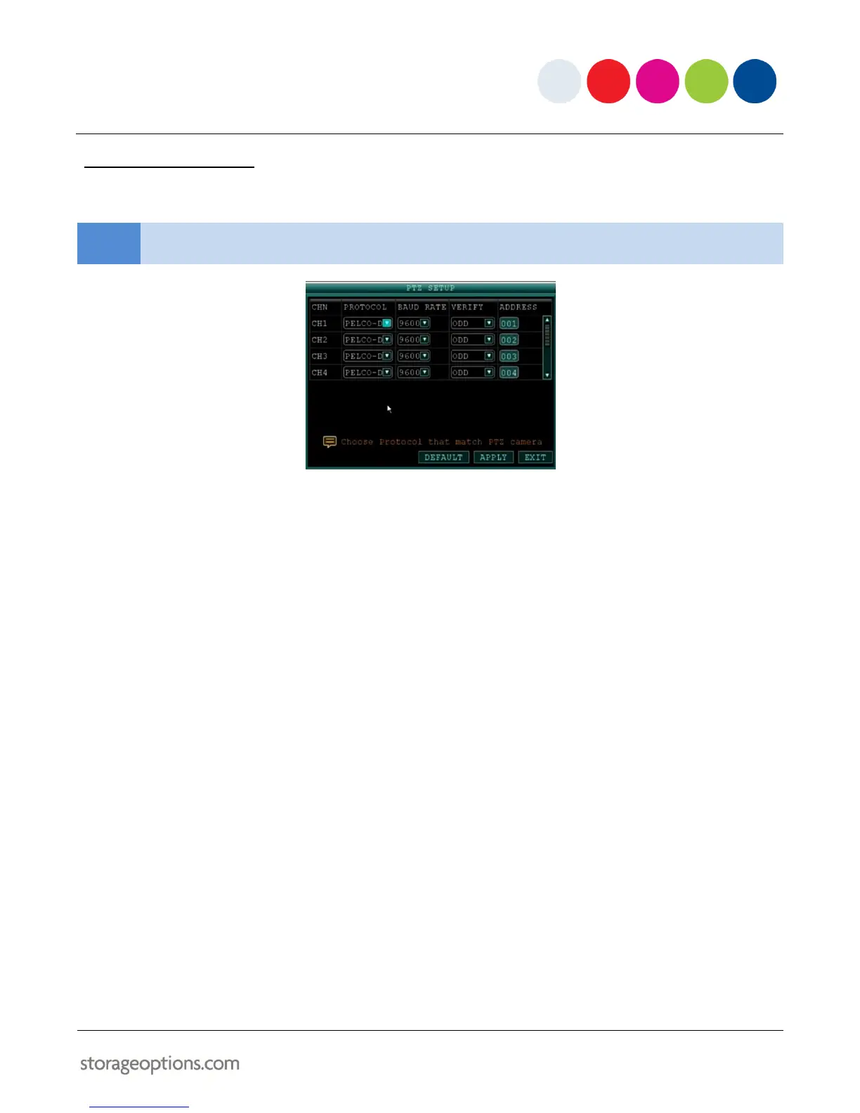 2. Under PROTOCOL, select PELCO-D or PELCO-P for the selected channel.