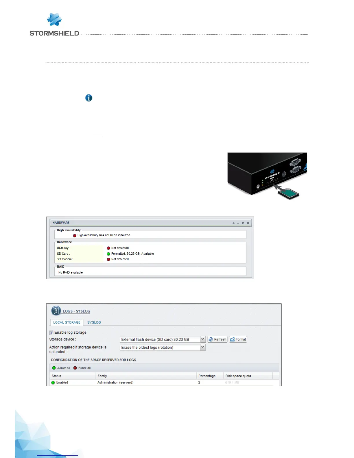 To enable the service, go to the Notifications menu, then to the Logs – Syslog module. The Local storage tab
