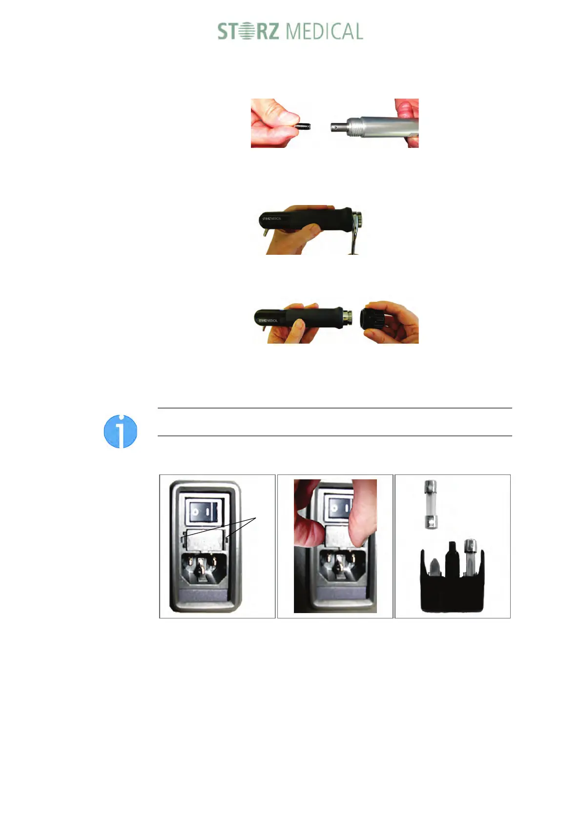 • At the indentations, push the two slides of the mains fuse holder inward and pull