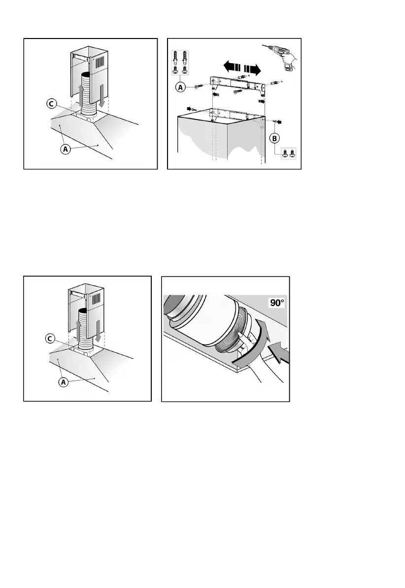 spodného komína a ostatnú časť nad rám. Zdvihnite horný komín do jeho držiaka a upevnite ho skrutkami B