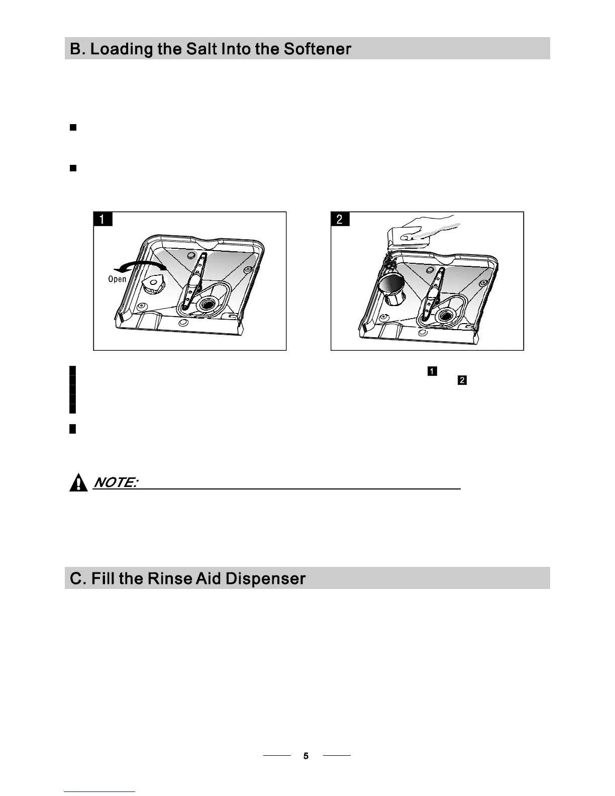 C Fullfill the salt containerwith water.It is normal for a small amount of water to come out of the salt container.
