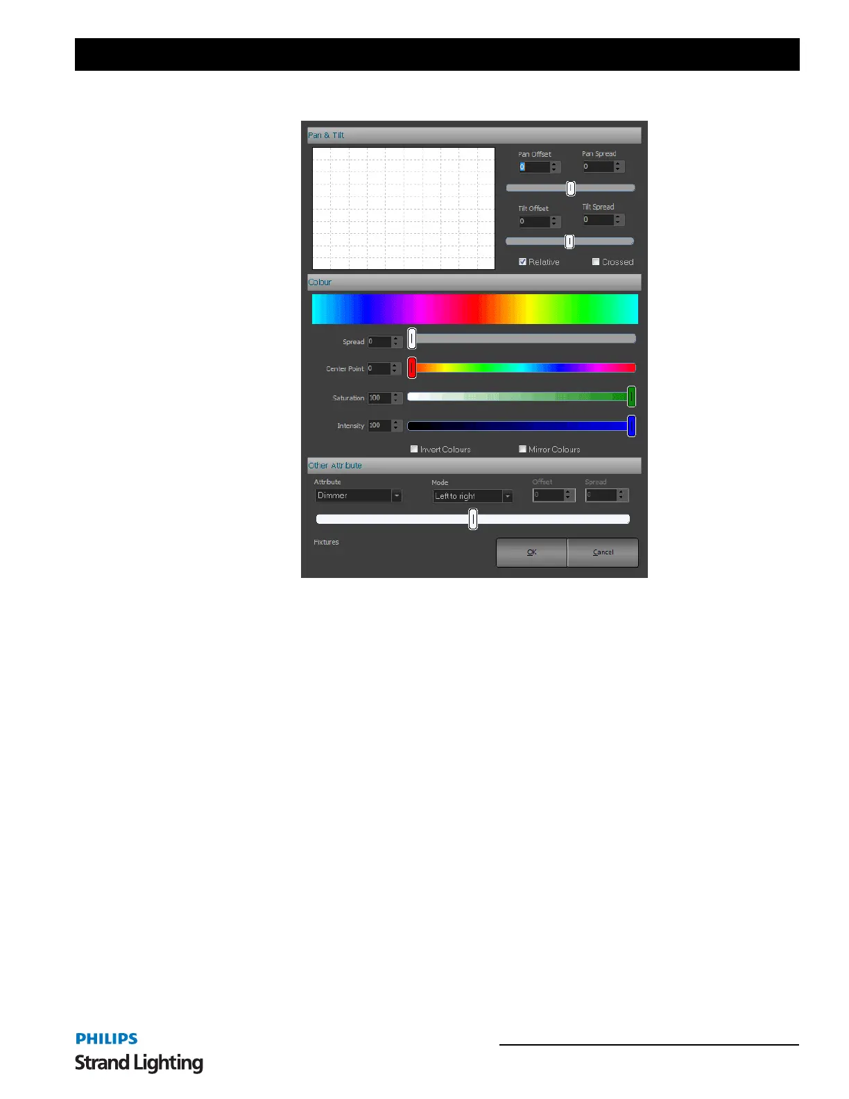 Use the "Relative" check box to fan pan and tilt relative to the current location of the fixtures.