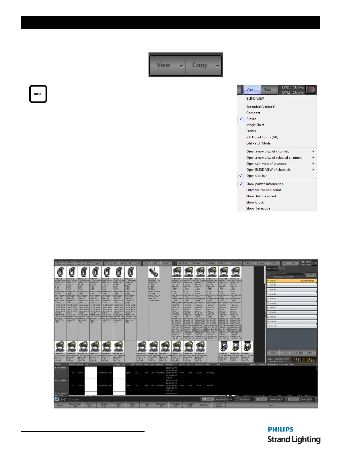 The channel view window has six modes of displaying fixtures and channels.