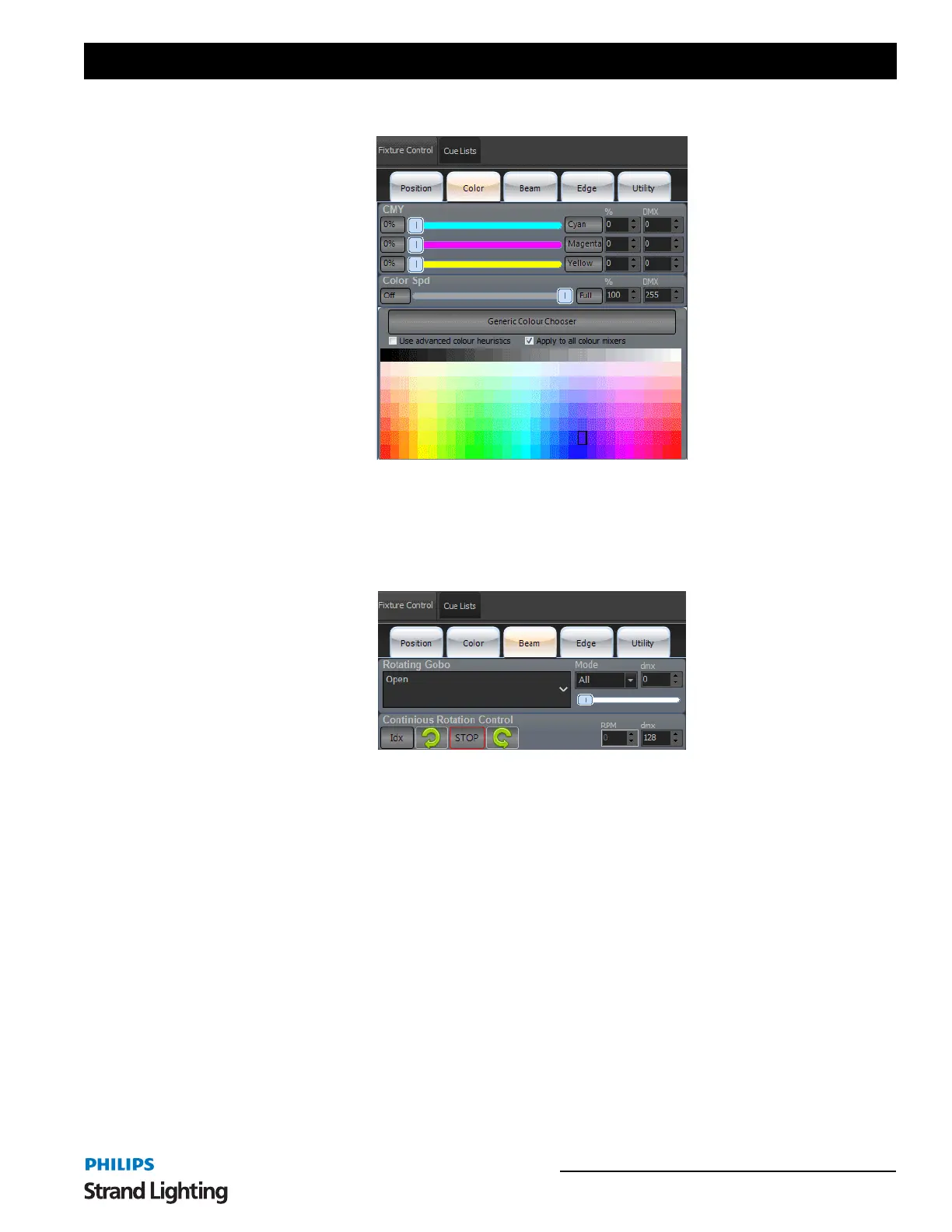 selected, the interface will adjust to show the appropriate controls. This includes RPM speed and raw DMX values.