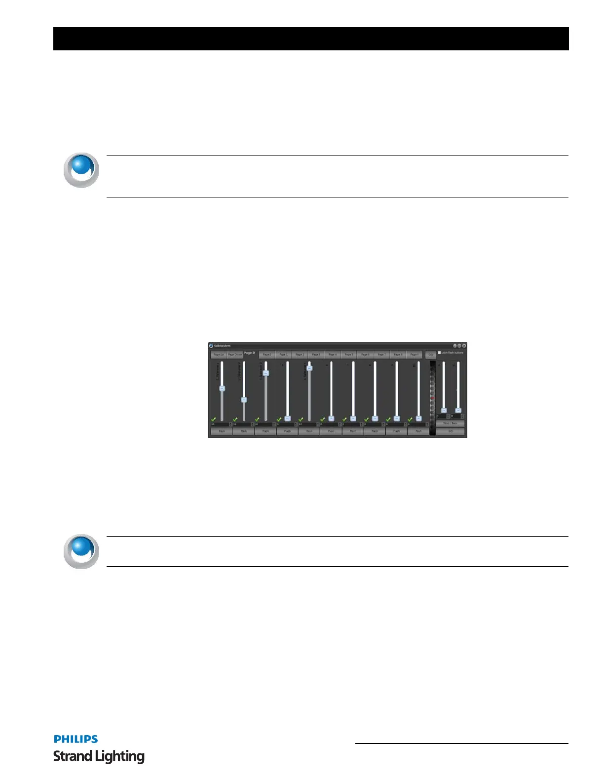 At the top of this window is a series of buttons to change the submaster page. Changing the page in this window will