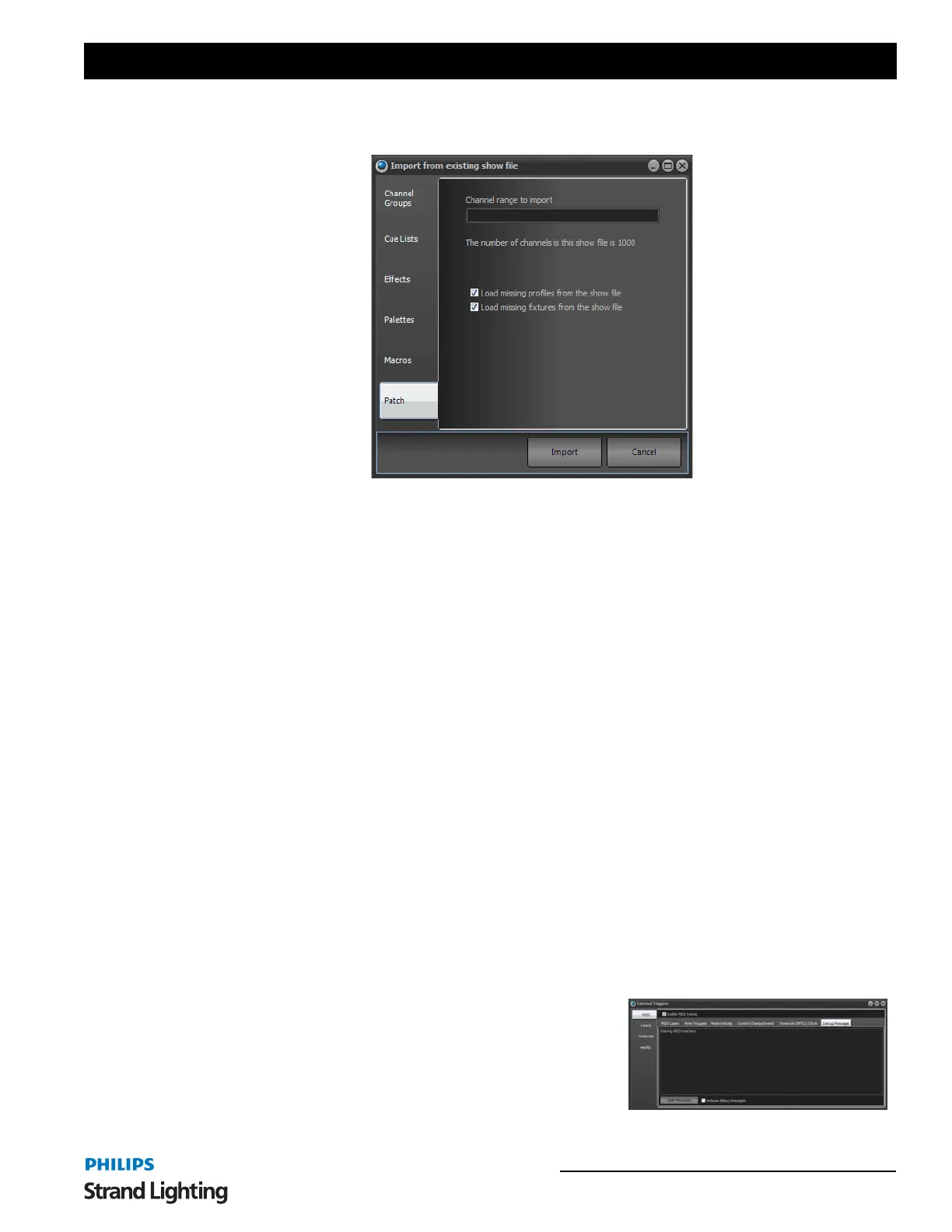 import. You can select to import Channel Groups, Cue Lists, Effects, Palettes, Macros and Patch information.