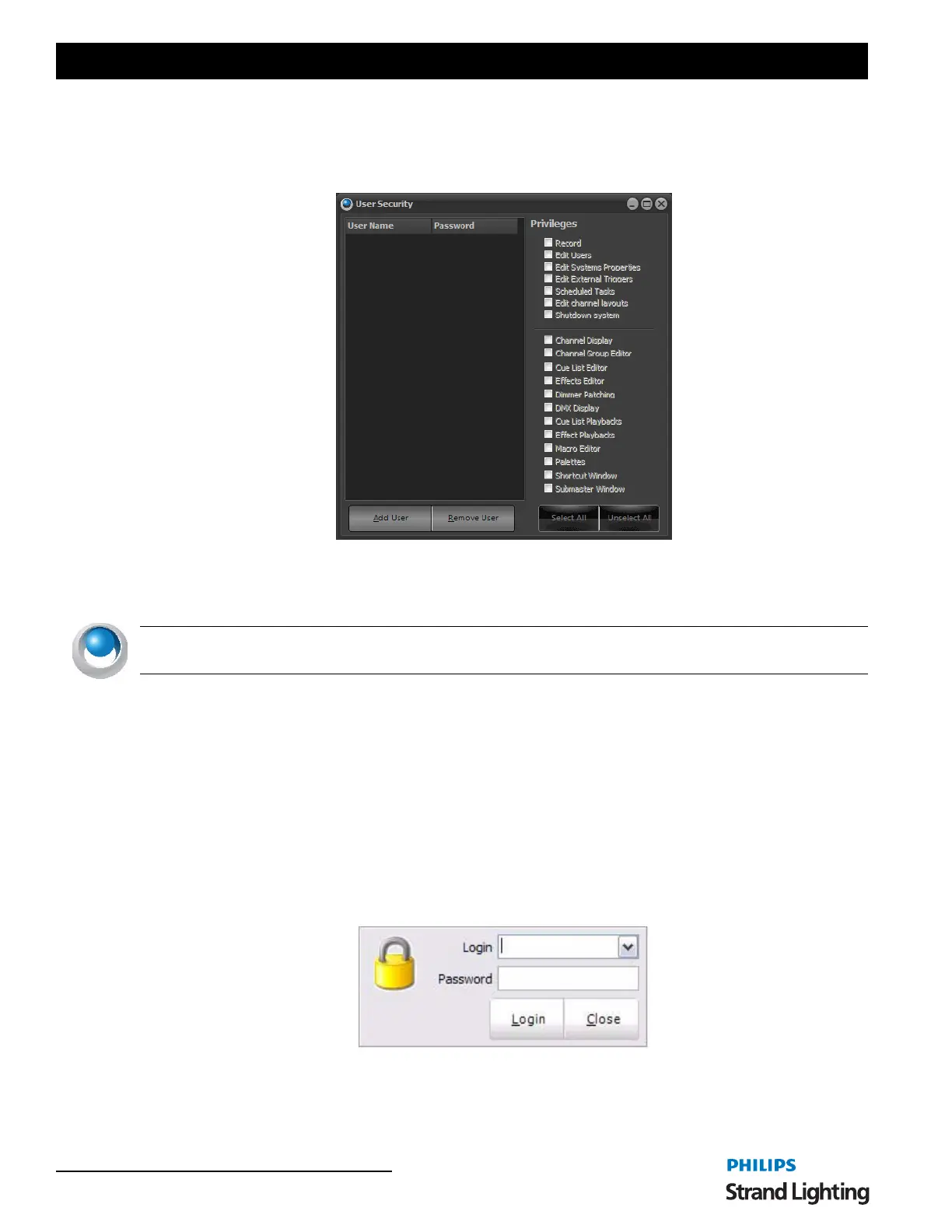 Most of the security features center around allowing or denying access to the various windows within the software.