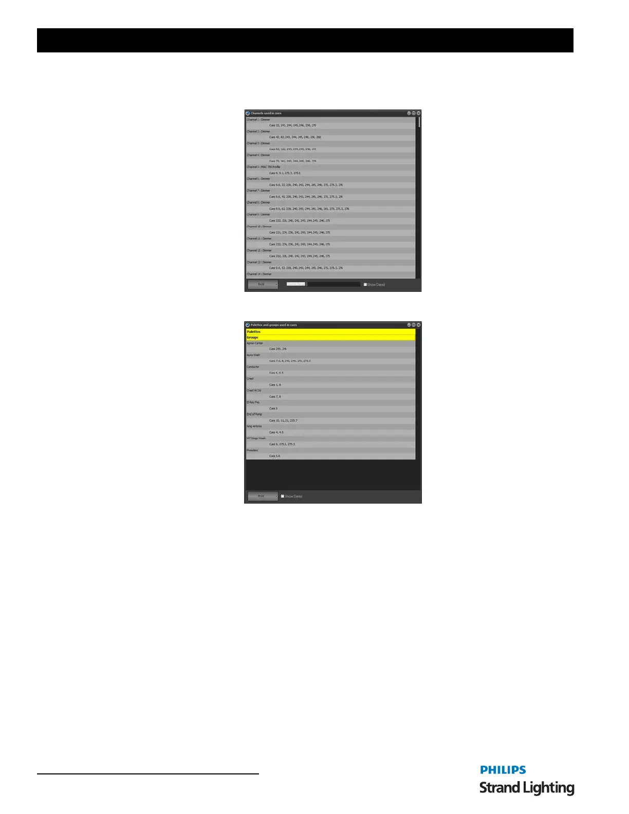 Channels Used In Cues - shows a list of cues and the channels stored in them.