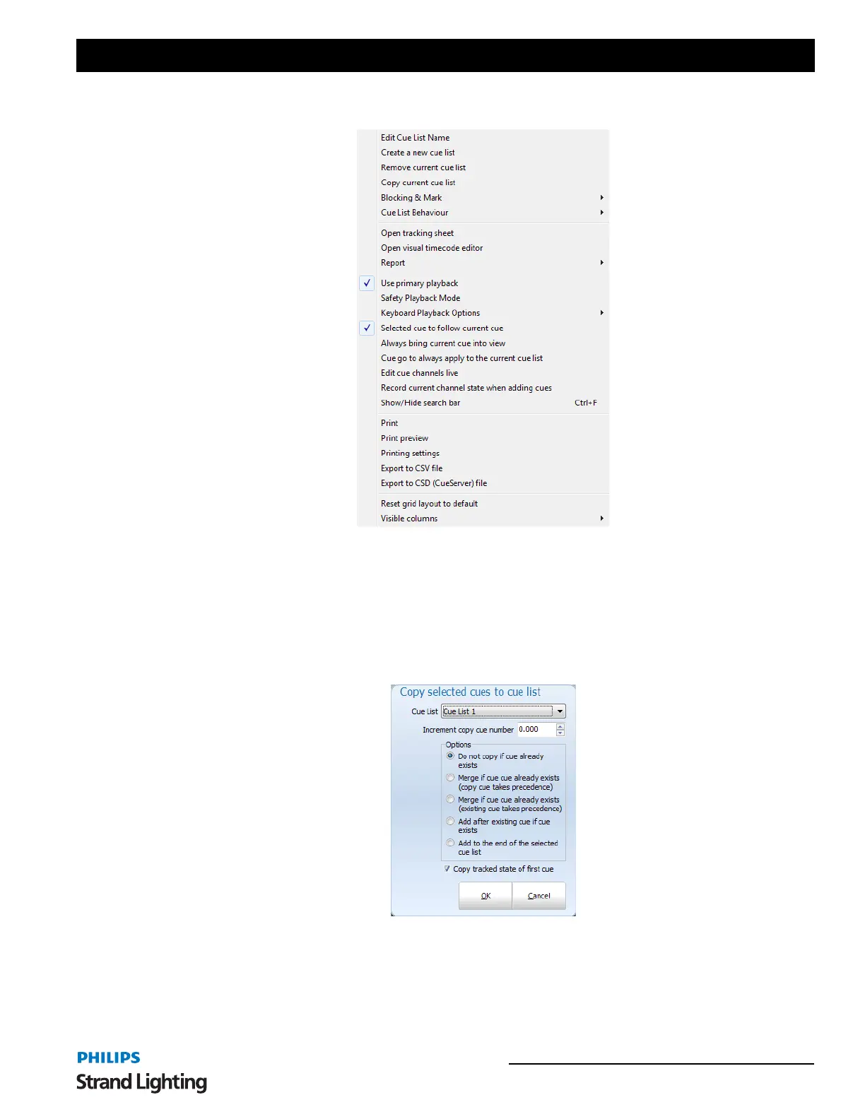 To assist with many tedious tasks the "Cue Options" drop down menu provides several convenient options related to