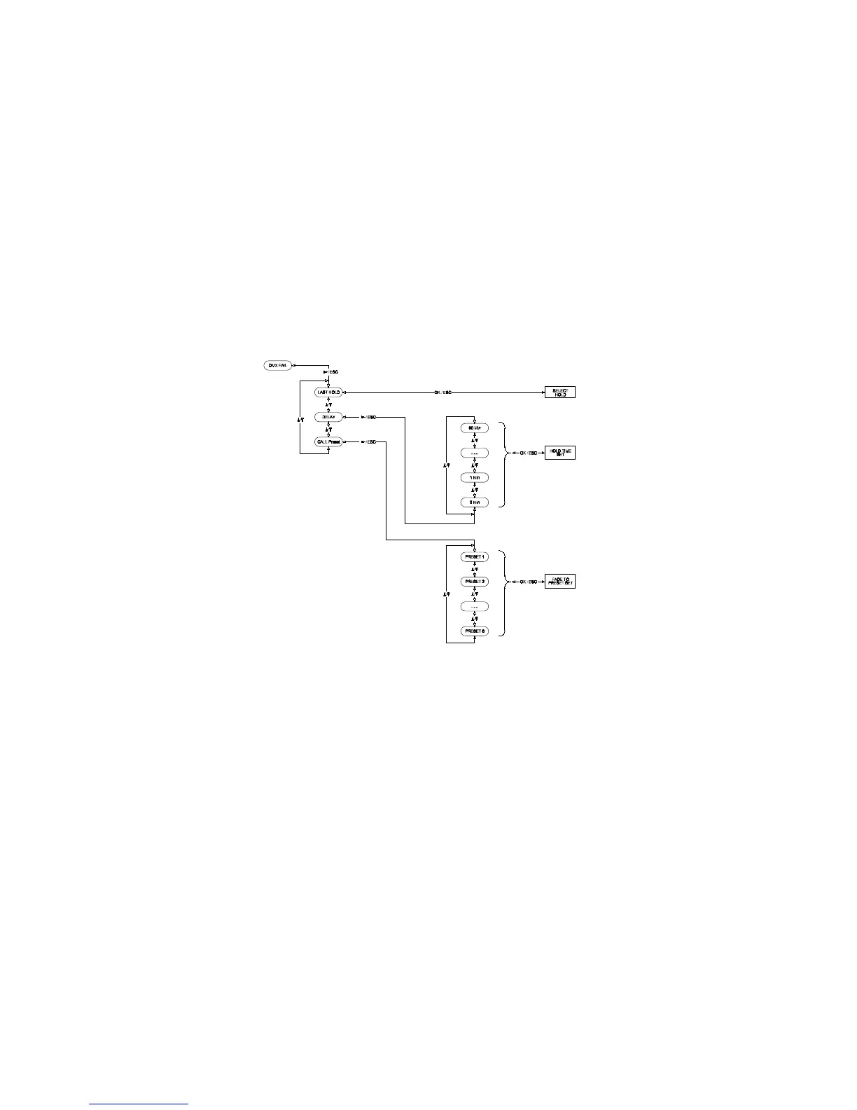 For DMX fail, use Up/Down buttons to select either Call Preset 1-8, Last