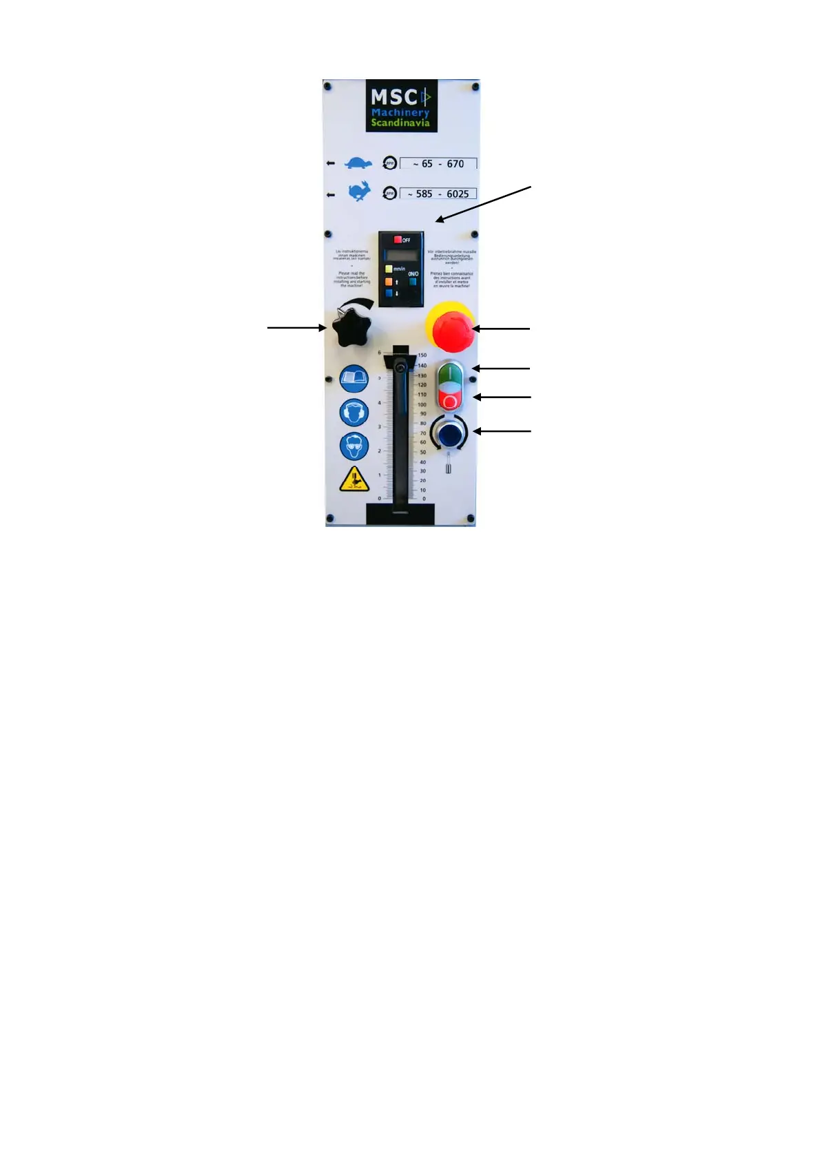 (4) Speed adjustment knob, (5) Emergency Stop,
