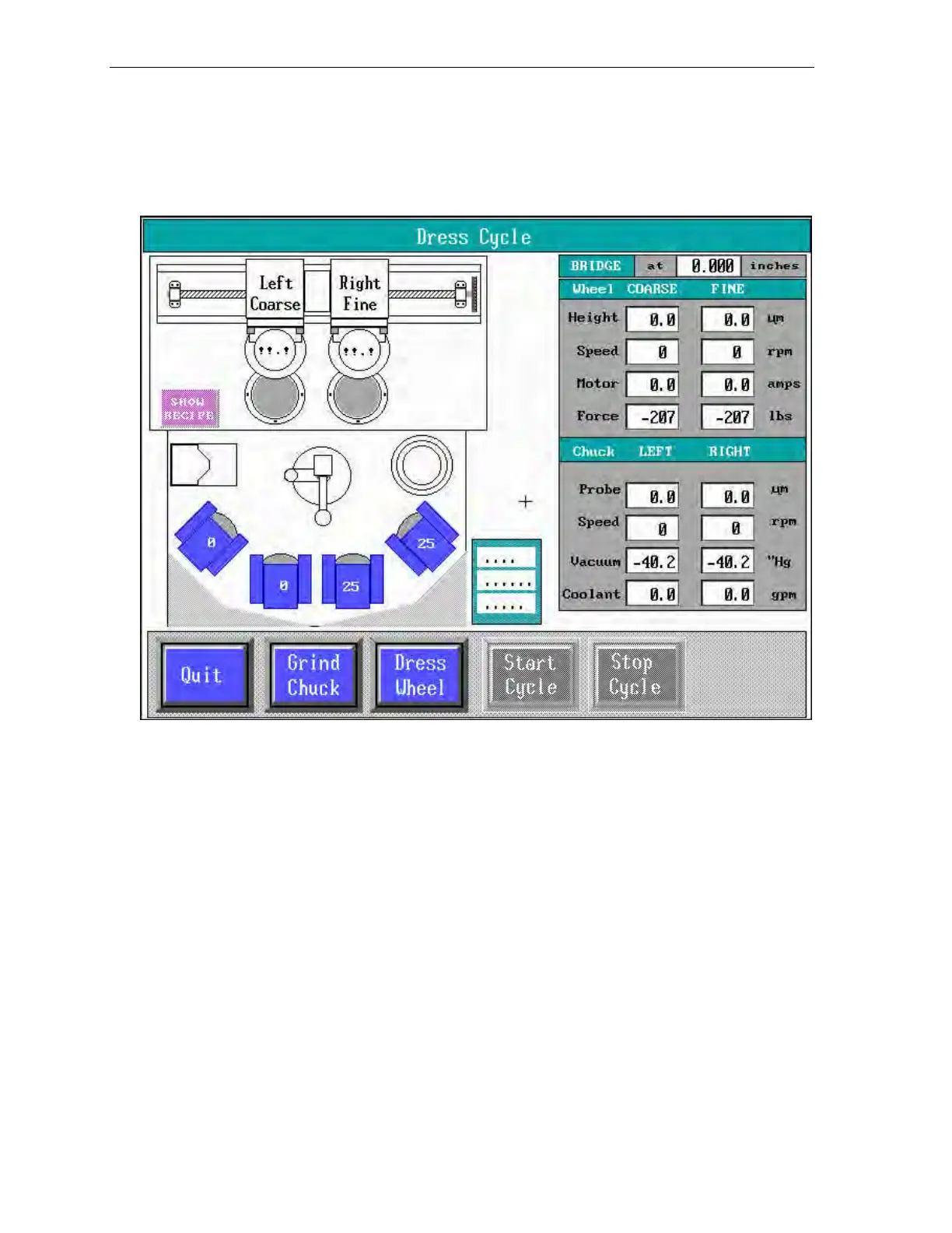 The Dress Cycle menu runs automatic routines for truing and dressing the grind