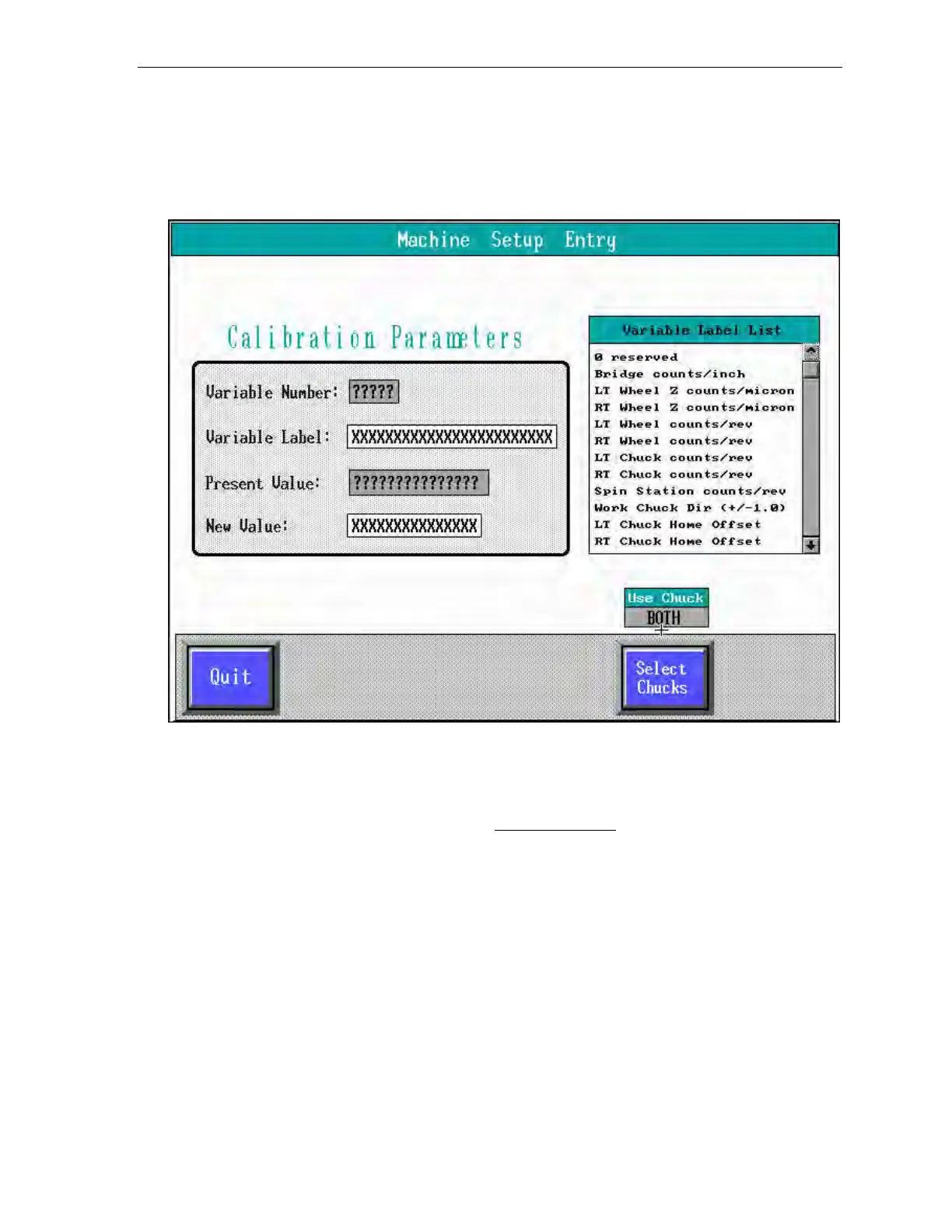 The Machine Setup menu lists the current values of the calibration list variables and