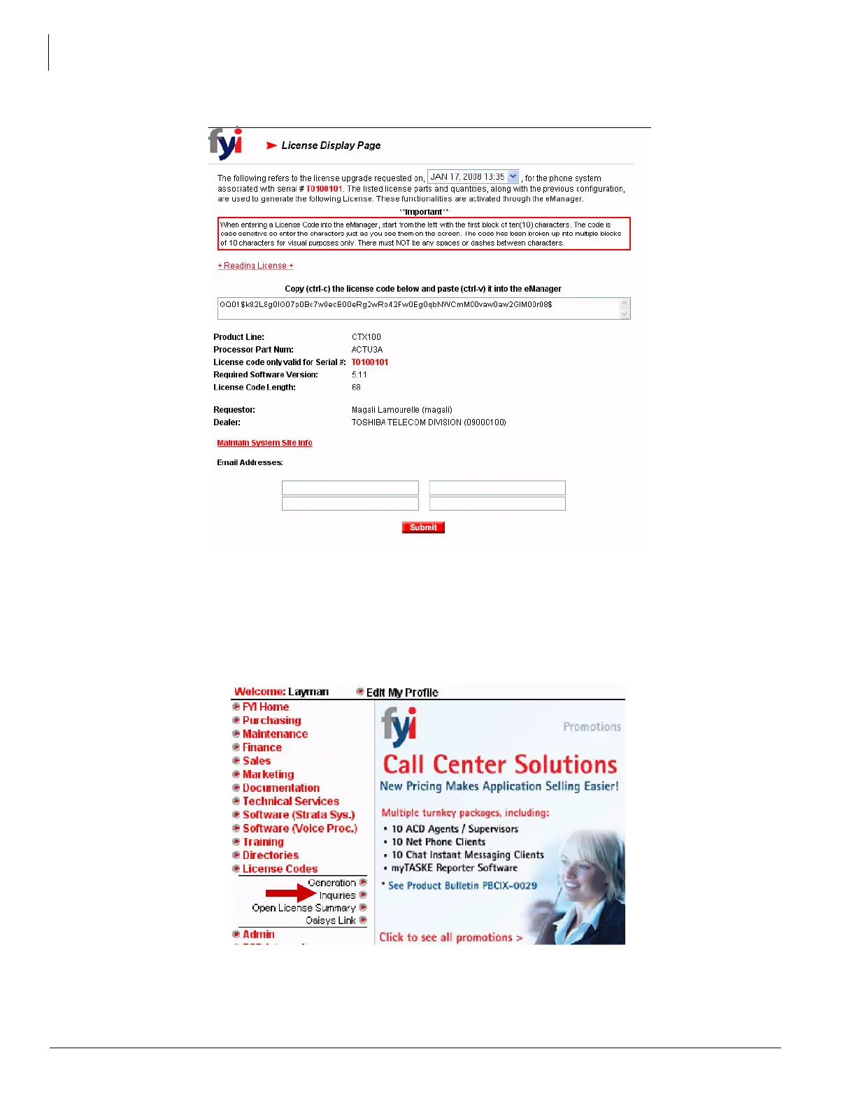 1. Click on License Codes. A drop-down box appears - click Inquiries.