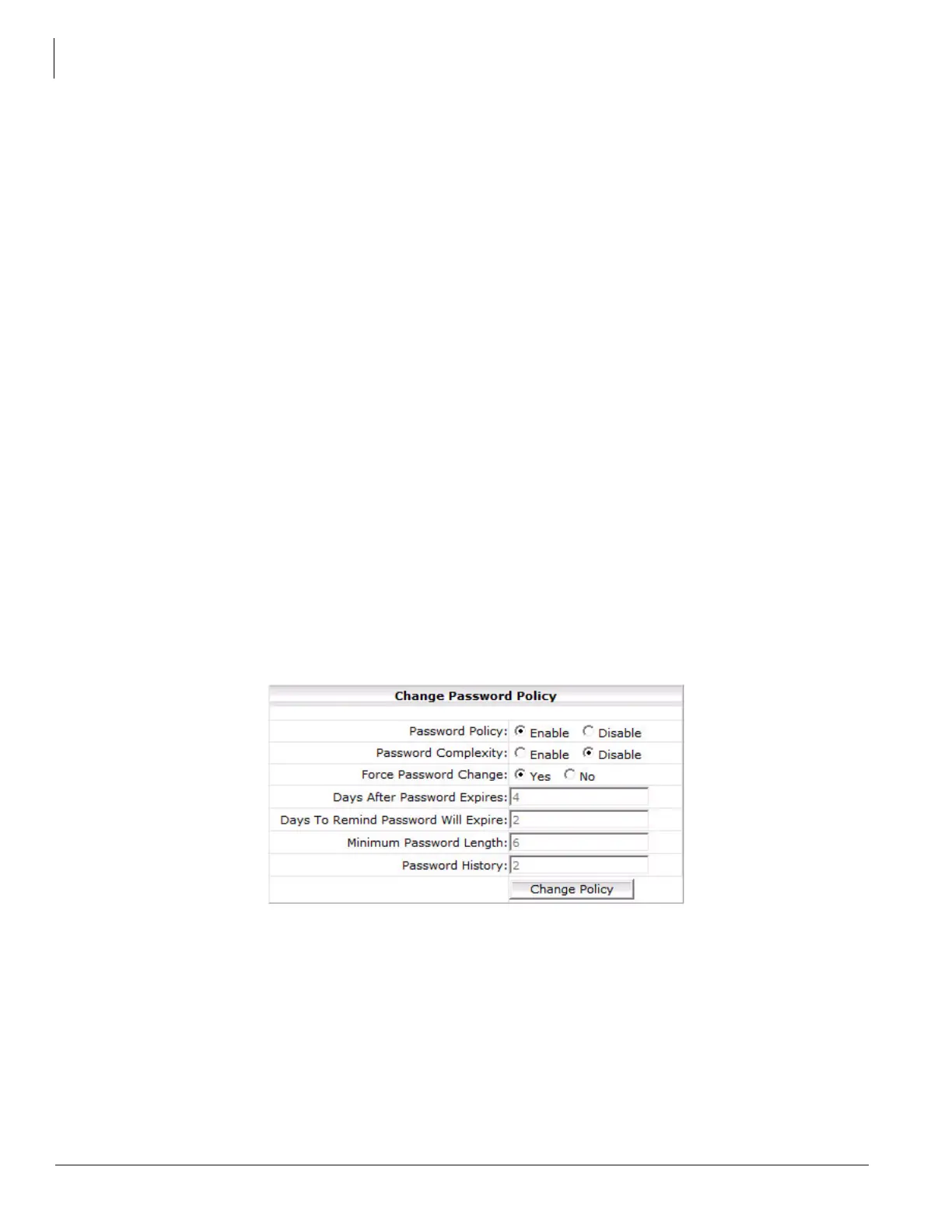 Using the password policy setting, the Administrator can either disable or enable the password security scheme for