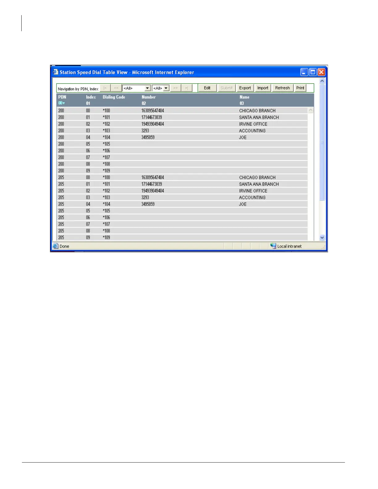 Example: Upload Network Calling numbers for stations 200~207.