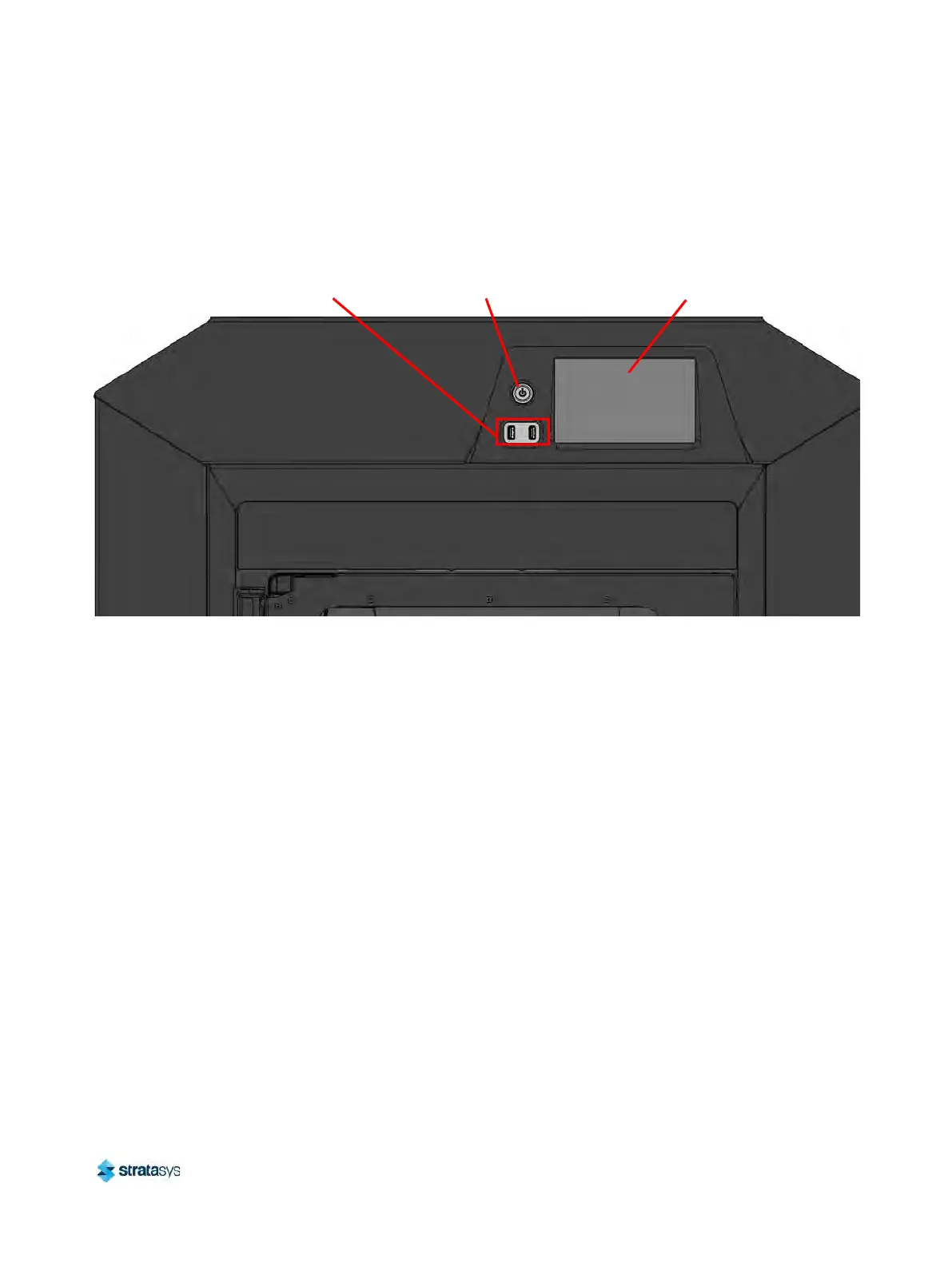 The interface panel houses the printer’s touchscreen user interface, power button, and USB