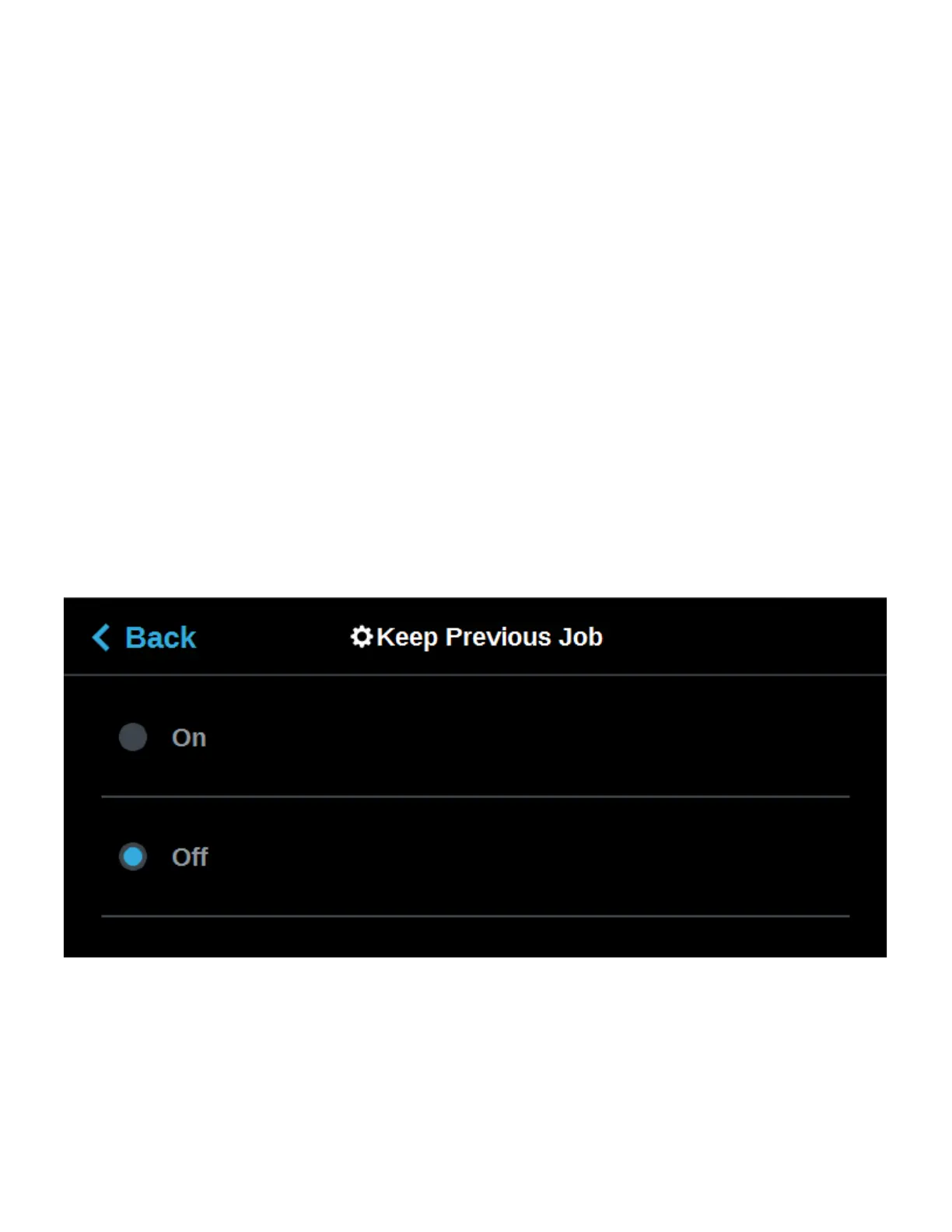 To configure this setting, press anywhere within the Keep Previous Job row; the Keep Previous Job page will be