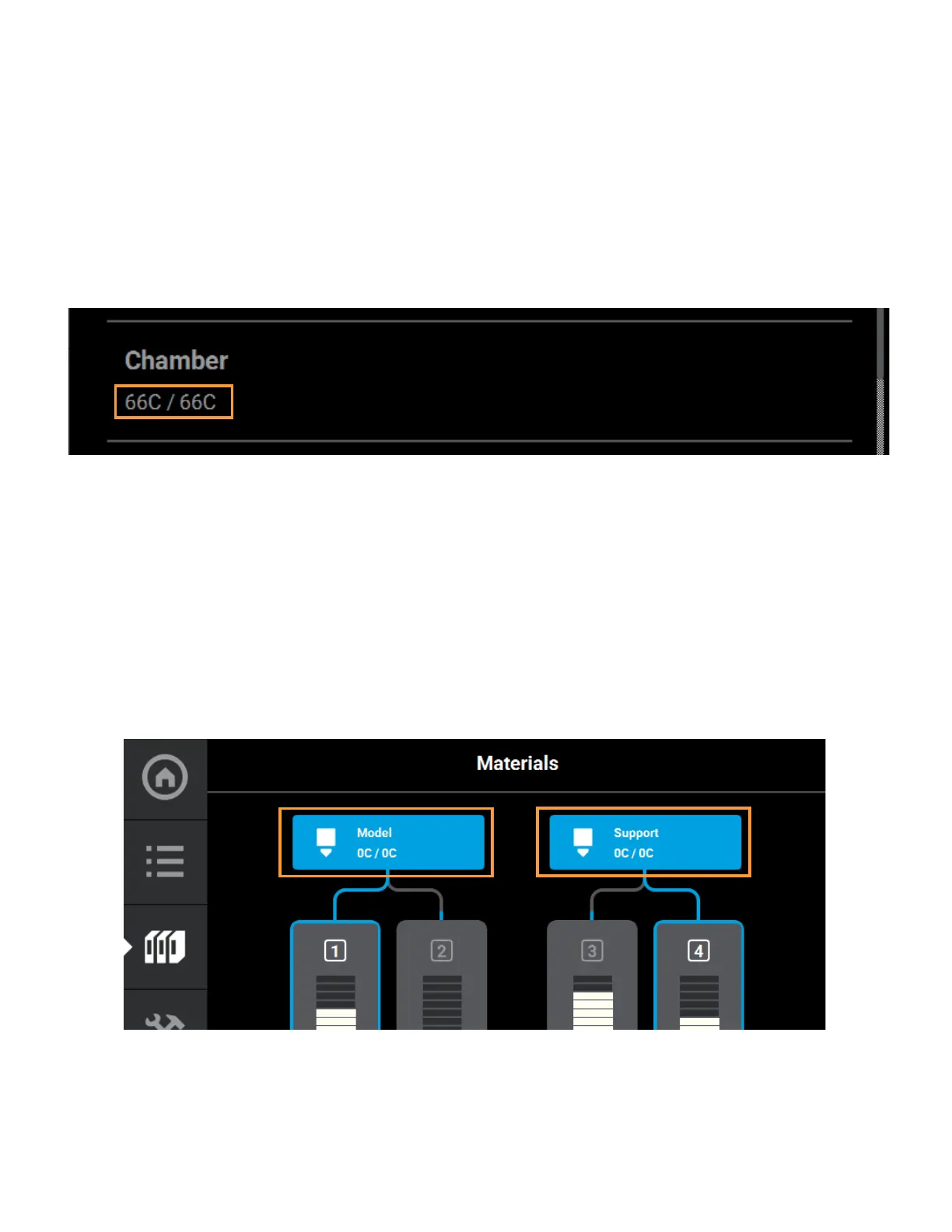 To view temperature information pertaining to the model and support heads within the Materials page:
