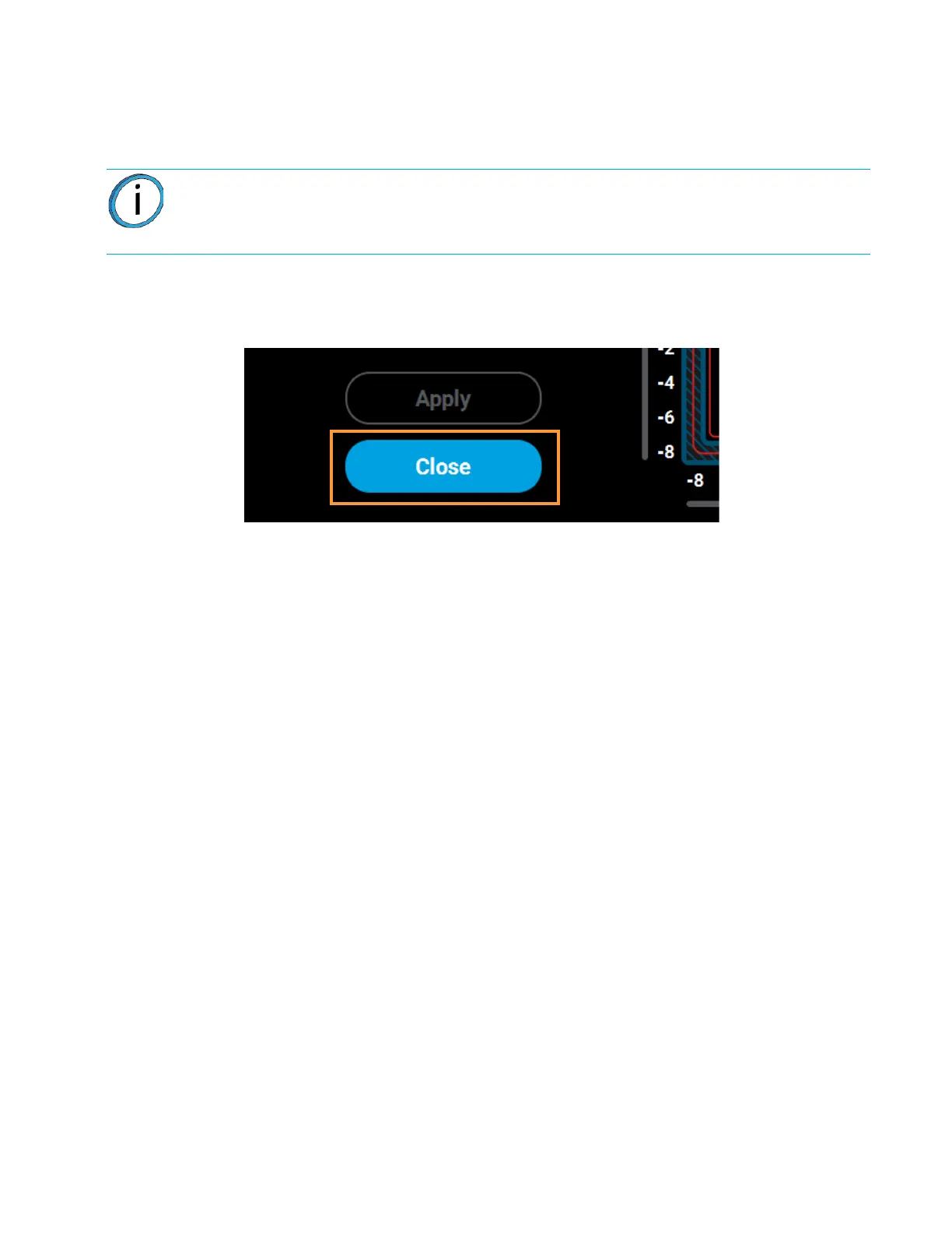 • After pressing the Apply button, the Close button will appear. Press the Close button to return to