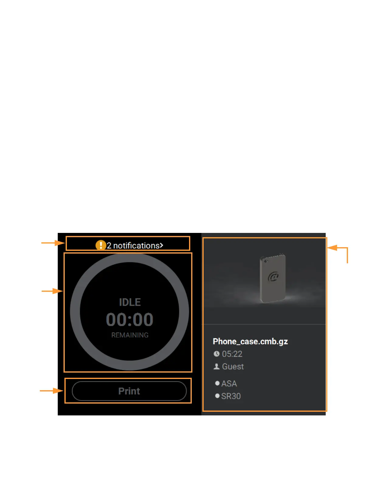 The Build page also contains the Notifications Display. Depending on the state of the printer a variety of