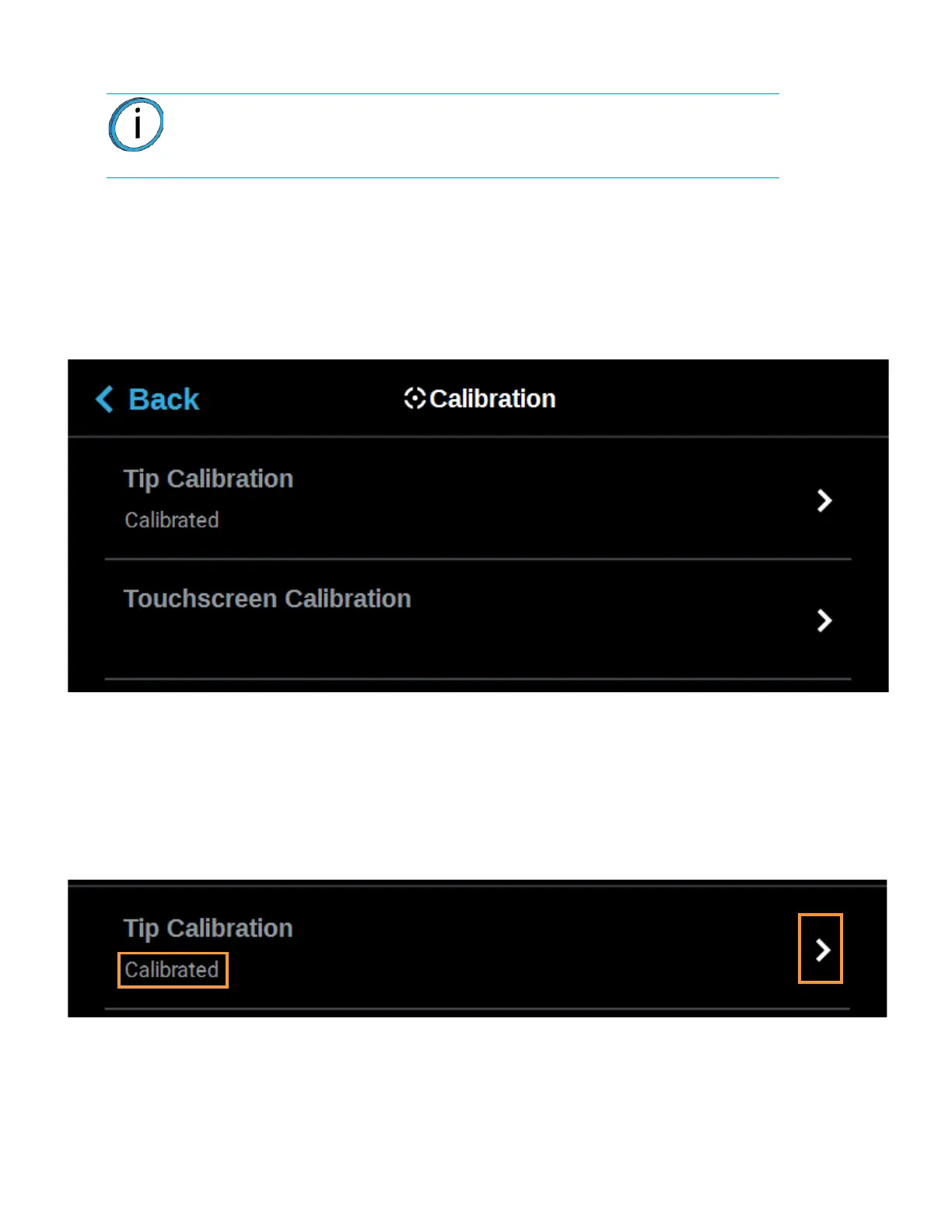 The printer’s calibration status will be displayed within the Tip Calibration row. Calibrated or Not Calibrated will