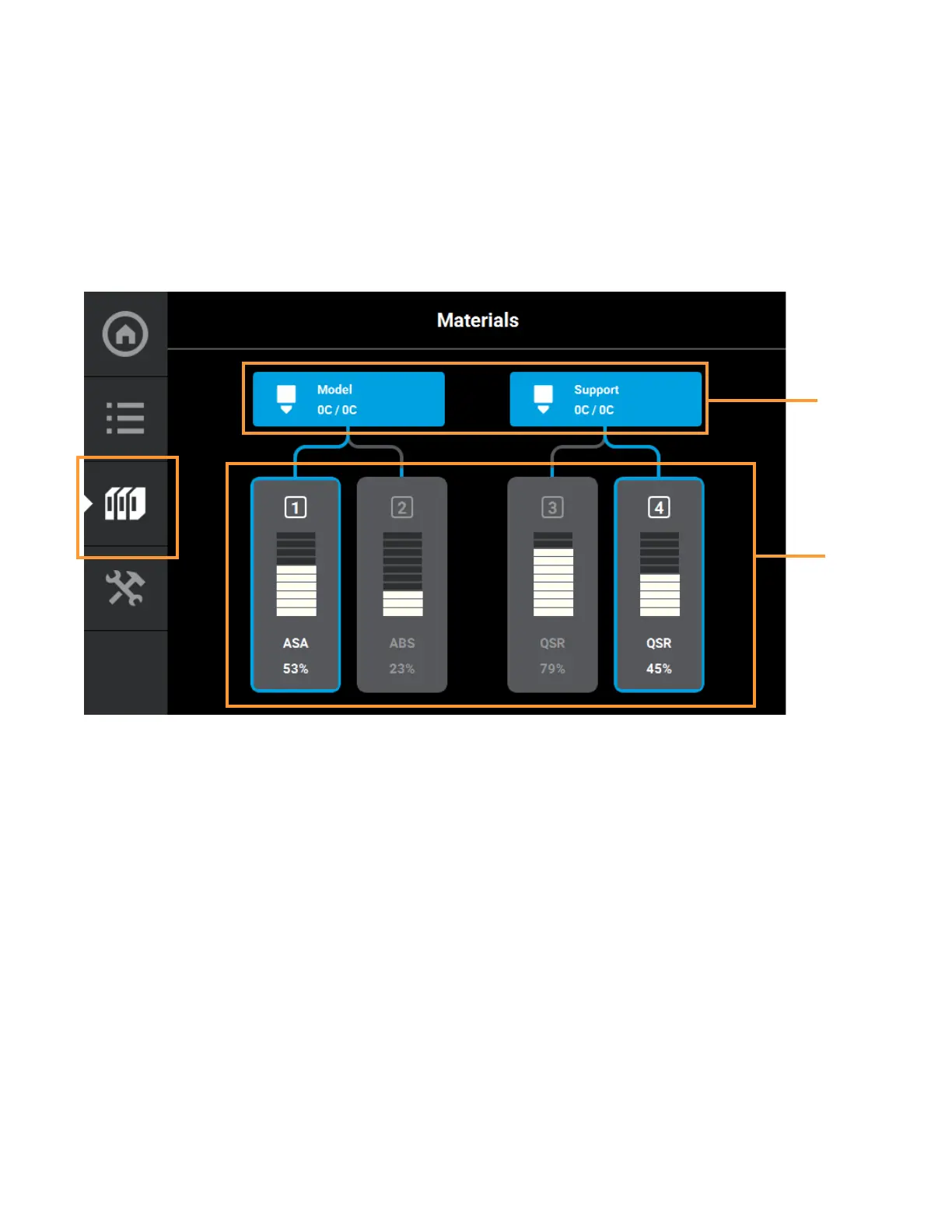 The Materials page displays a detailed representation of the printer’s current materials configuration. Within this