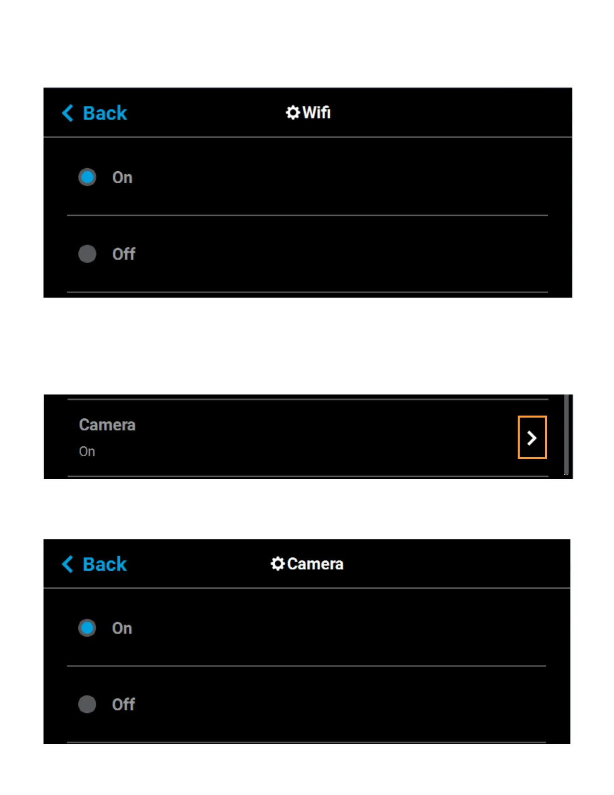To configure this setting, press anywhere within the row; the Camera page will be displayed. Use the radio