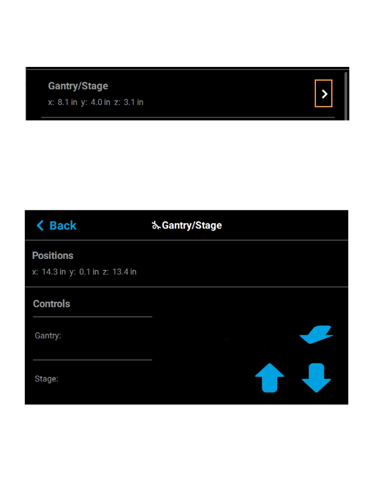 Position information for the X, Y and Z axes is displayed within the Gantry/Stage row. Pressing anywhere within