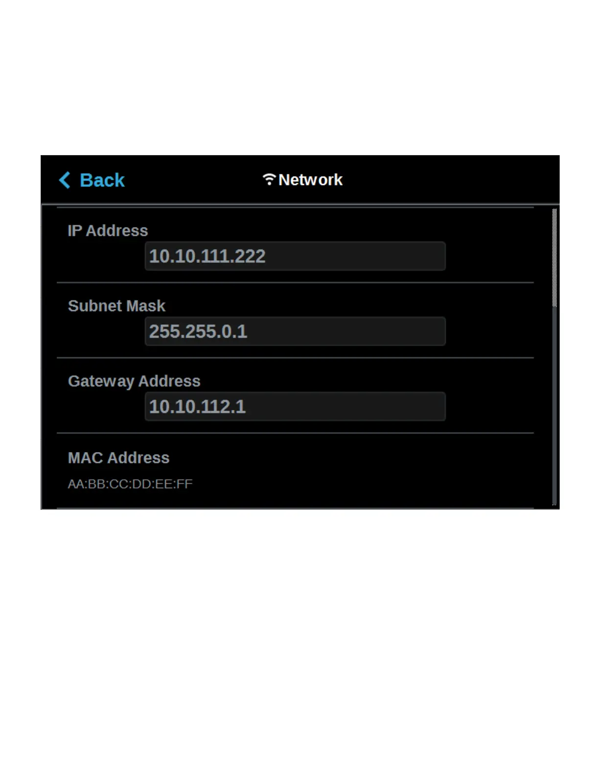 address will be displayed within the IP Address field, and corresponding Subnet Mask, Gateway Address, and