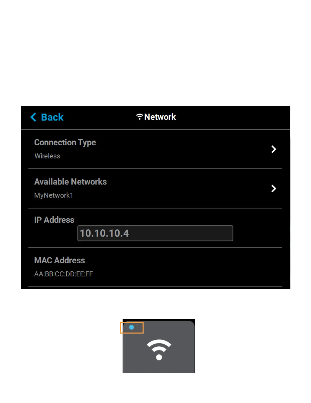 Press the Back button to exit the page and return to the Network page; the The name of the selected wireless