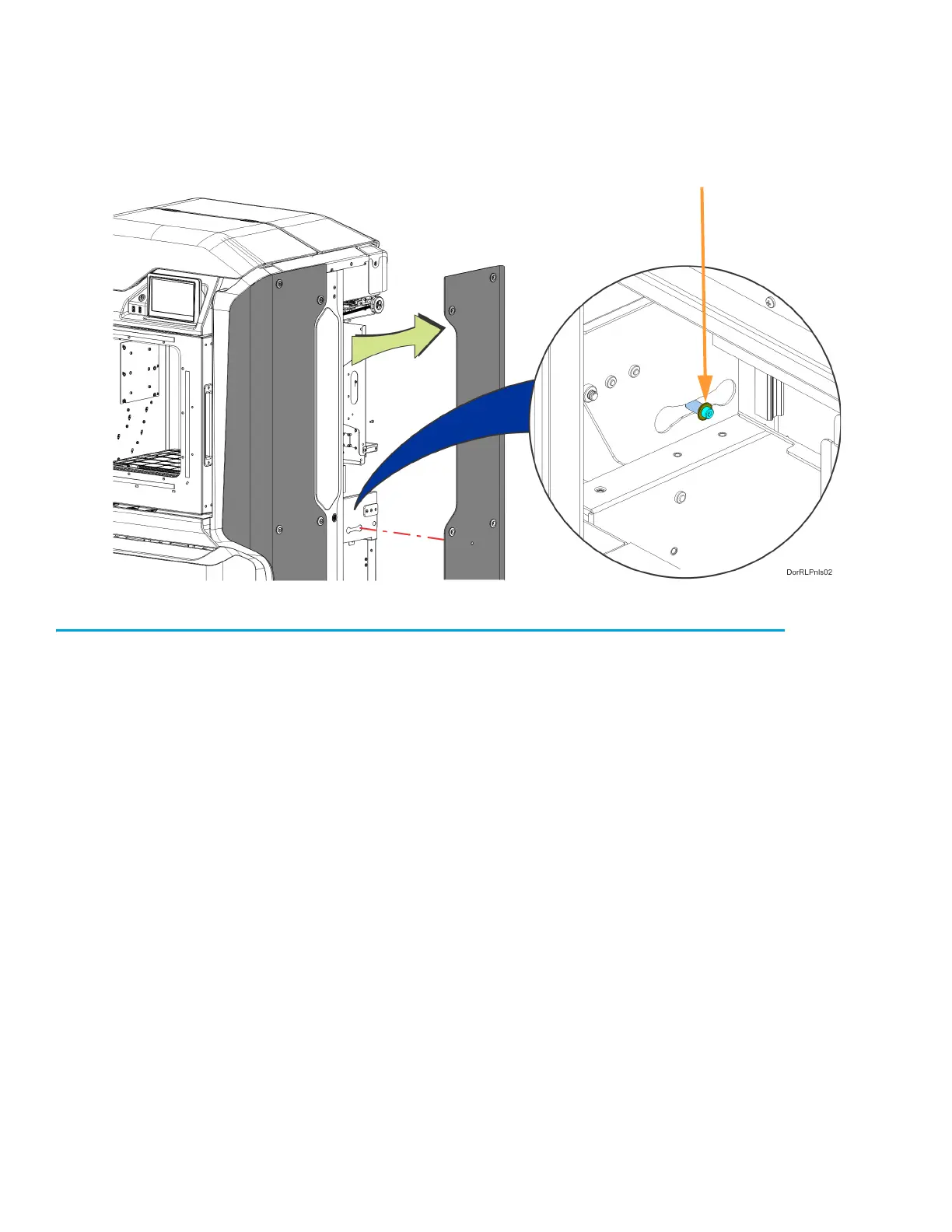 1. Insert the side panel retaining standoff into the hole in the printer frame and slide the panel into