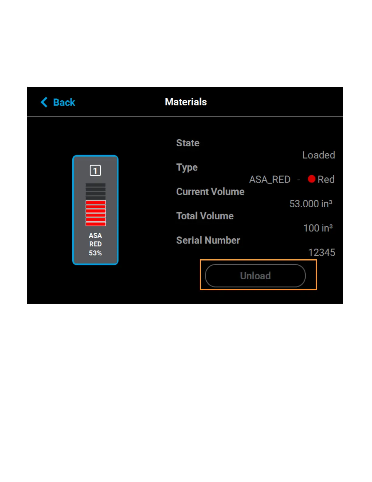 The Unload button will be displayed for all material spools whose filament is loaded to the corresponding head.