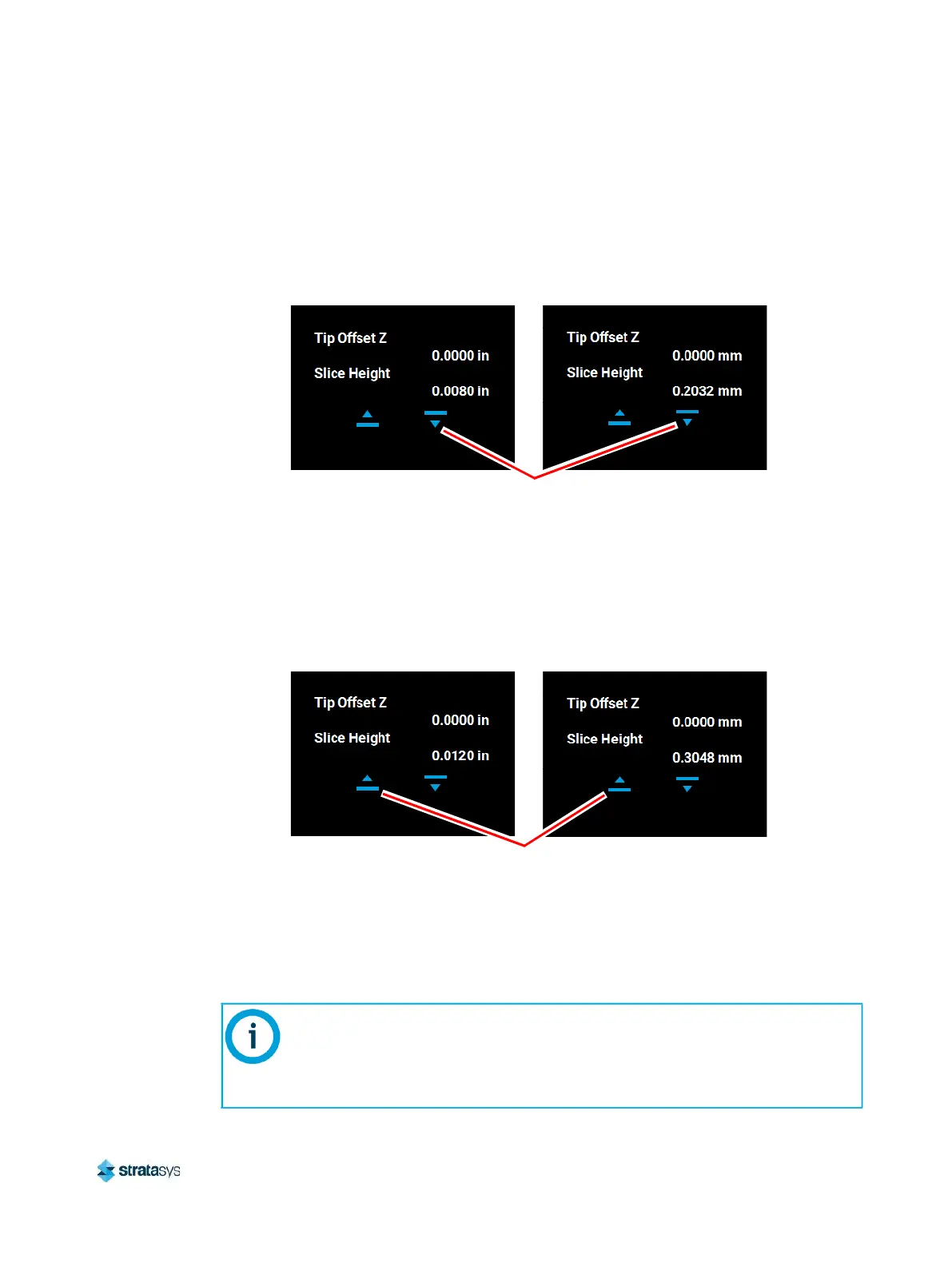 (0.3048 mm) for a tip with a slice height of 0.010 in. (0.254 mm), press the Up