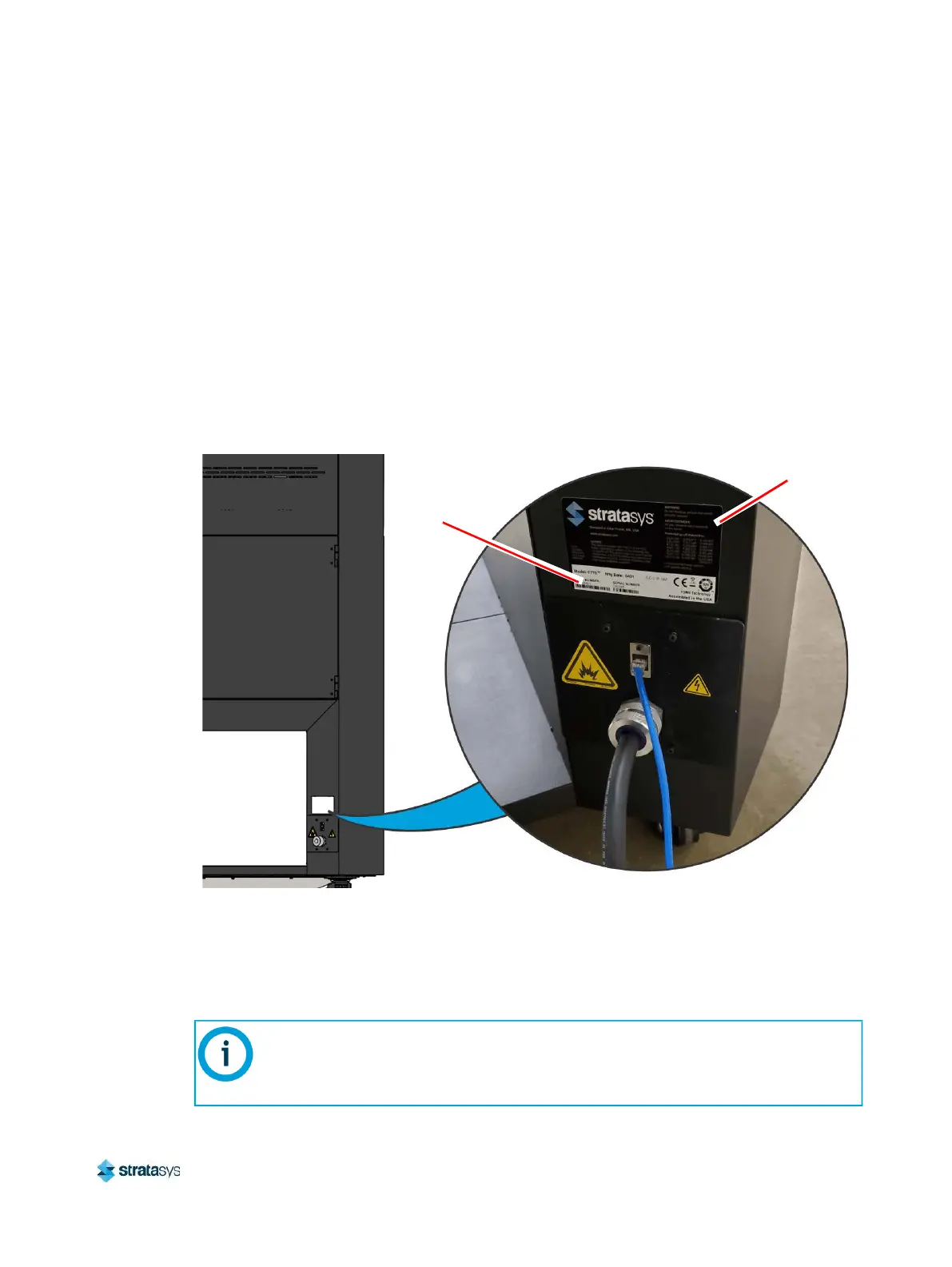 compliance information, voltage warnings, and the Stratasys web address.