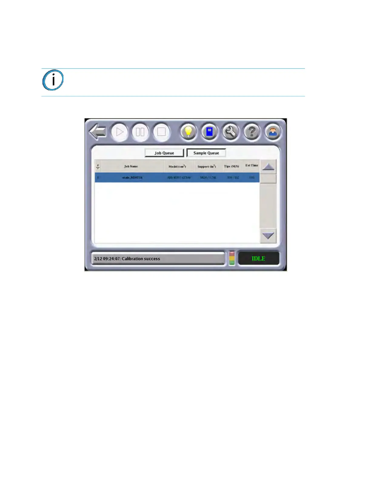 A list of stored sample jobs can be displayed by pressing the Sample Queue icon.