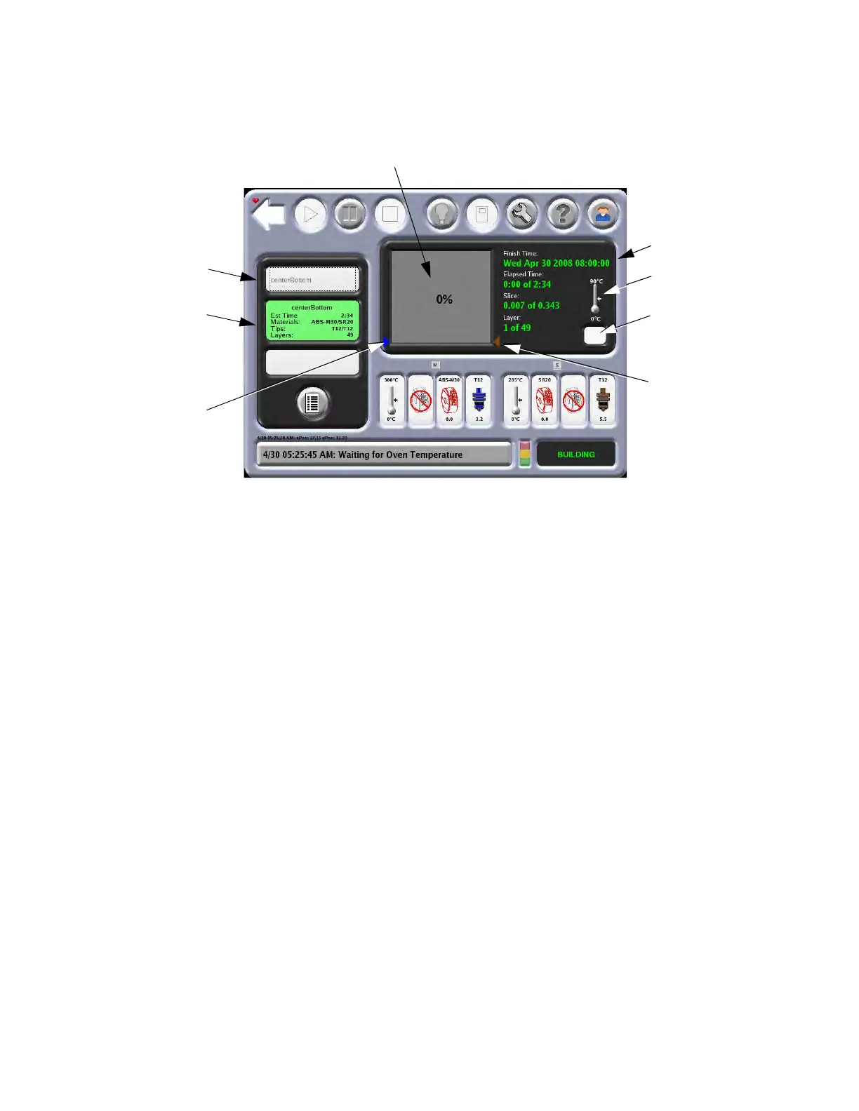 . Finished time, elapsed time displayed in hours and minutes, slice and number of layers.