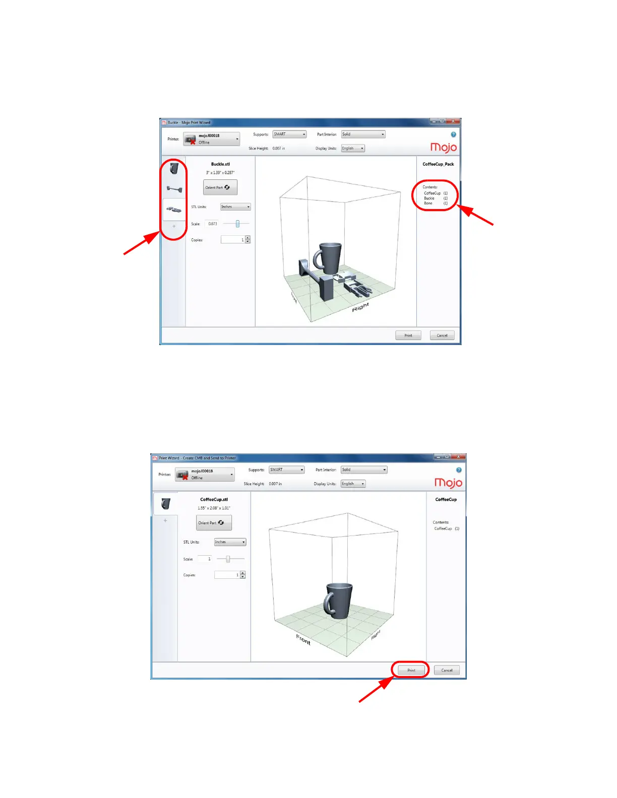 thumbnail view of the individual part(s) for all jobs are displayed on the left hand side of the Print Wizard screen.
