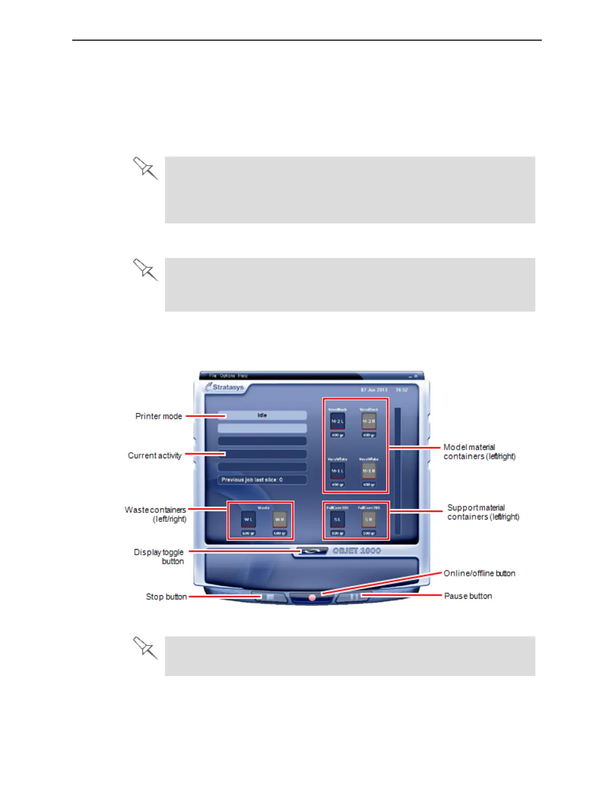 OnemonitordisplaysboththecomputerrunningObjetStudioandtheprinter