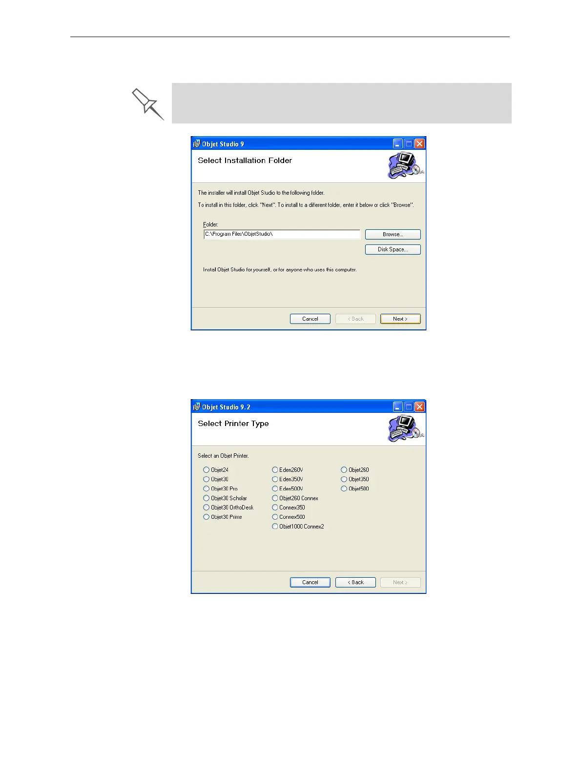 10. IntheSelectPrinterTypescreen,selecttheObjet3Dprinterusedfor