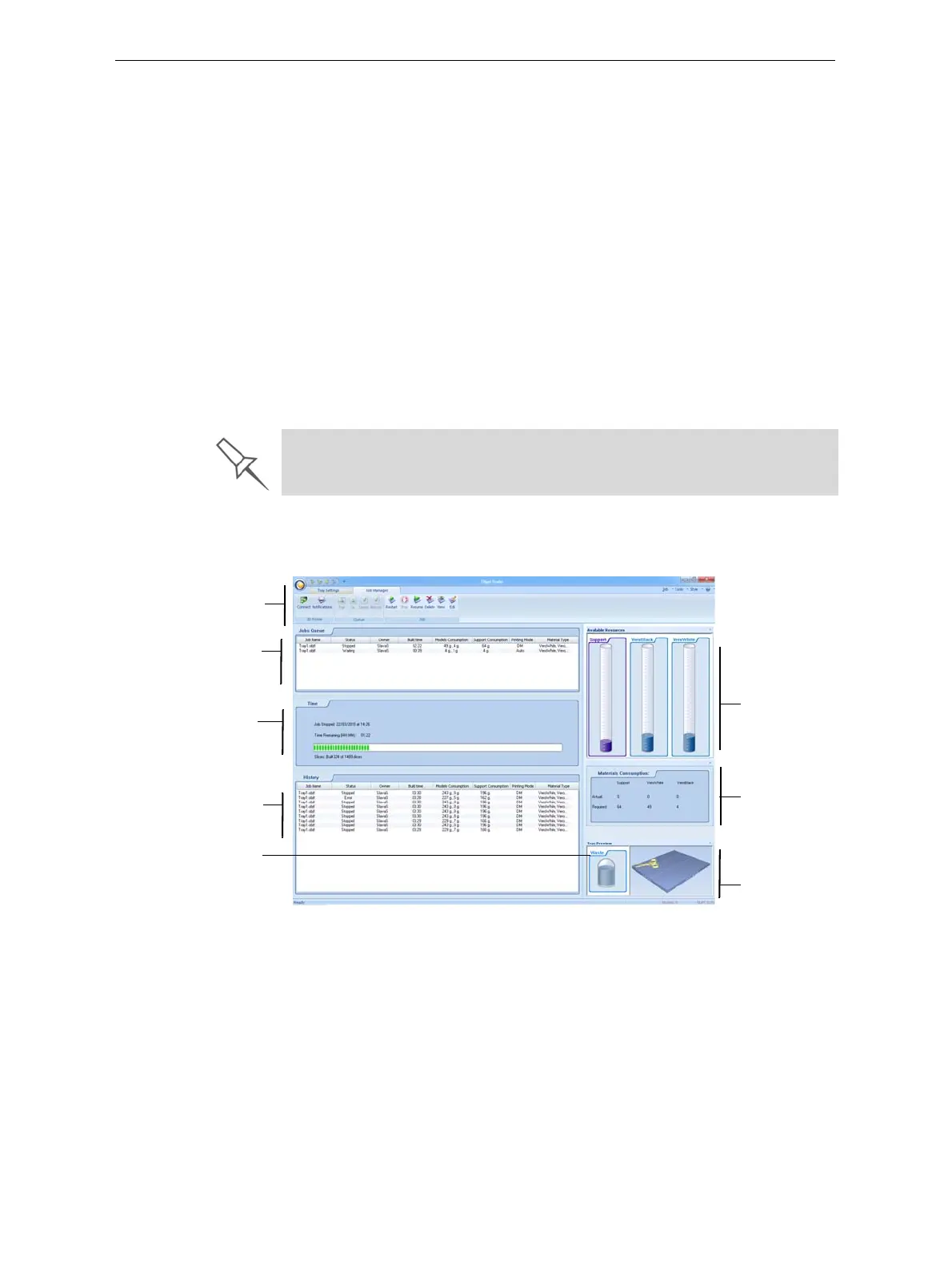 IntheJobManagerscreenofObjetStudio,youmonitorandmanagejobs