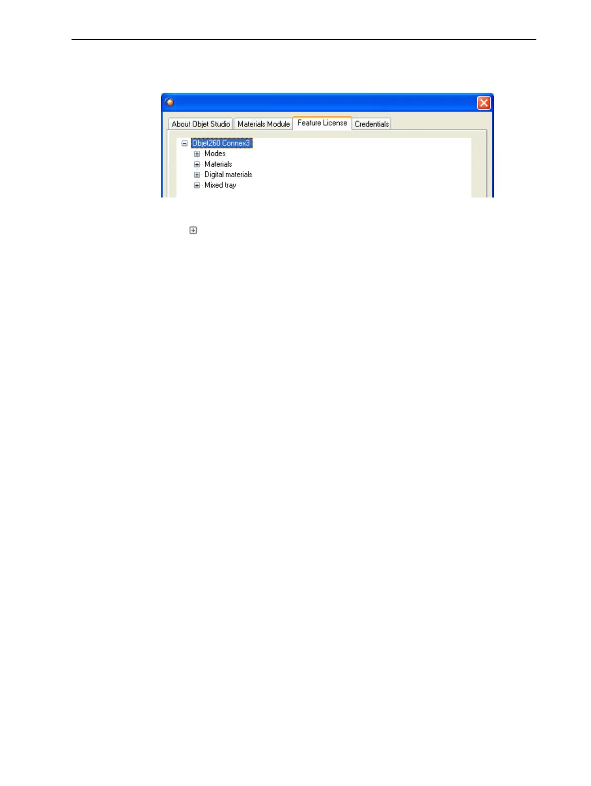 TheFeature LicensetabshowstheObjetStudiofeaturesavailablewithyour