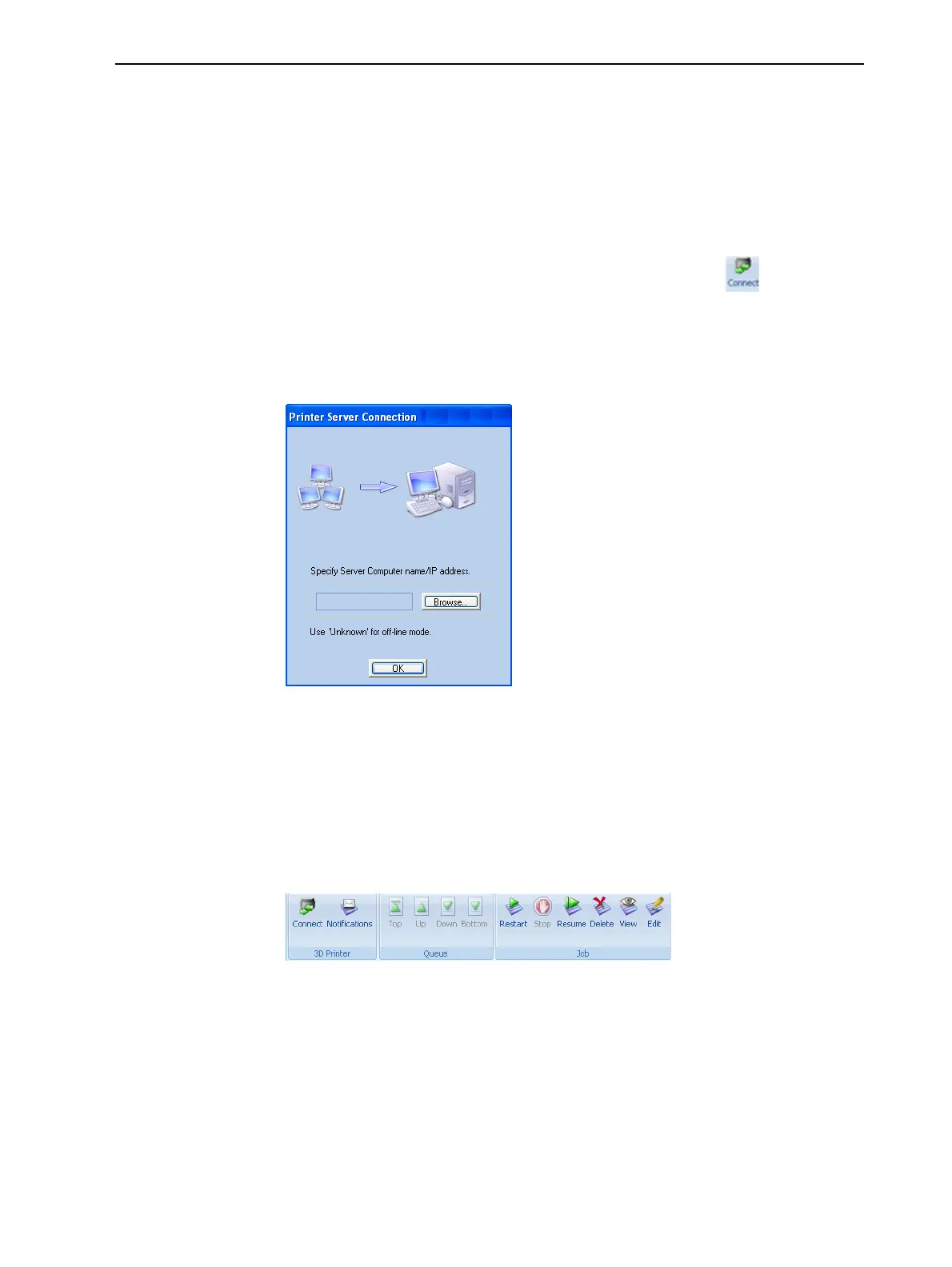 prompted to connect to a server computer that sends jobs to a 3D printer. To