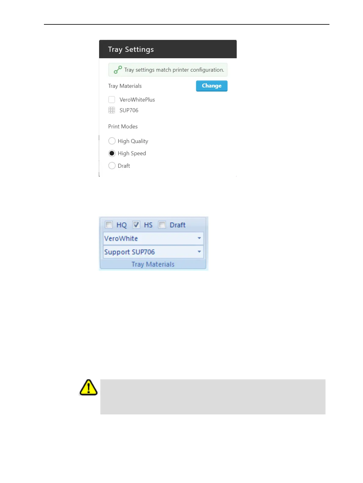 In Objet Studio, you select the printing mode in the Tray Materials area of the