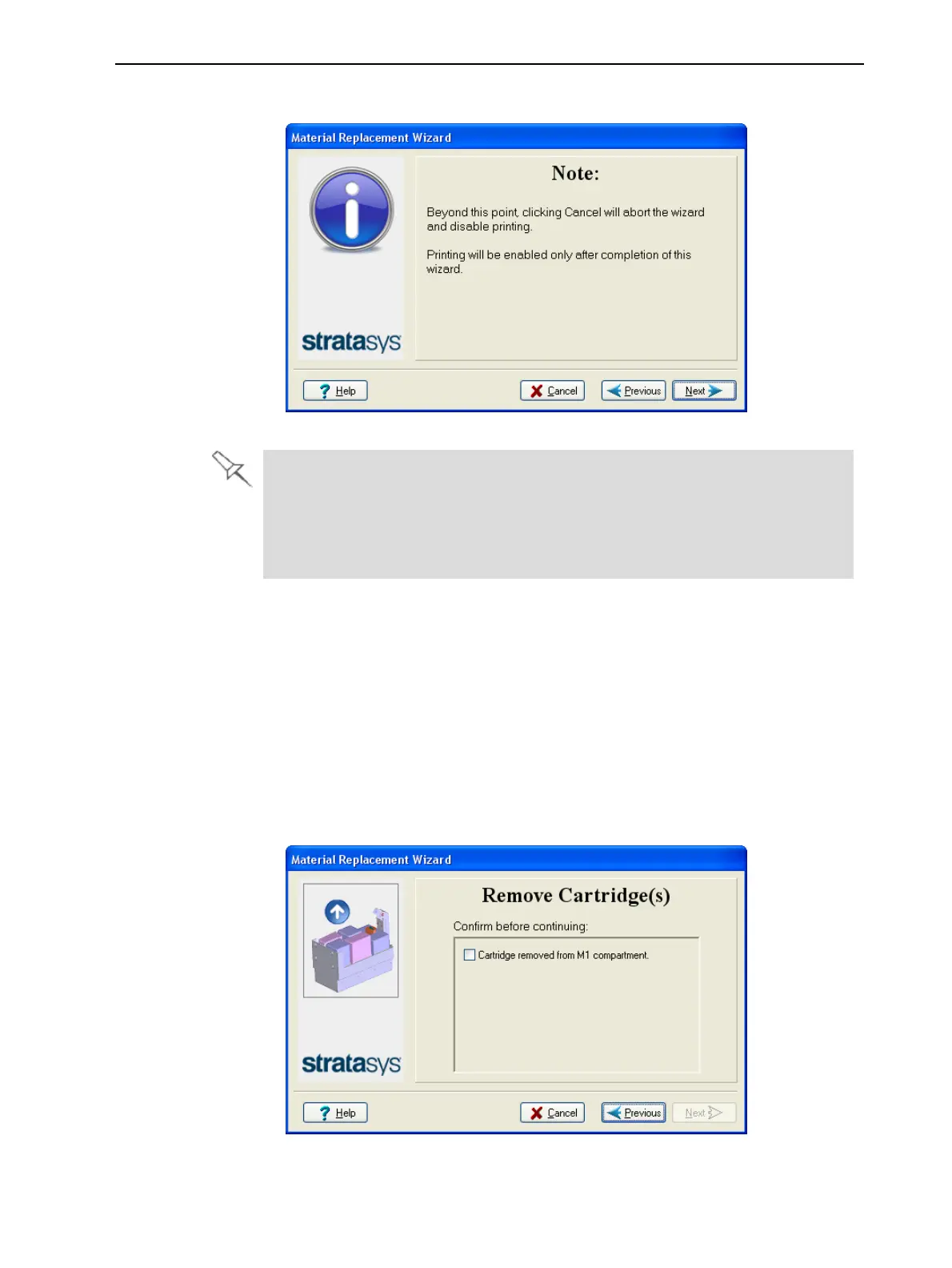 11. When prompted by the wizard screen, remove the material cartridge(s).