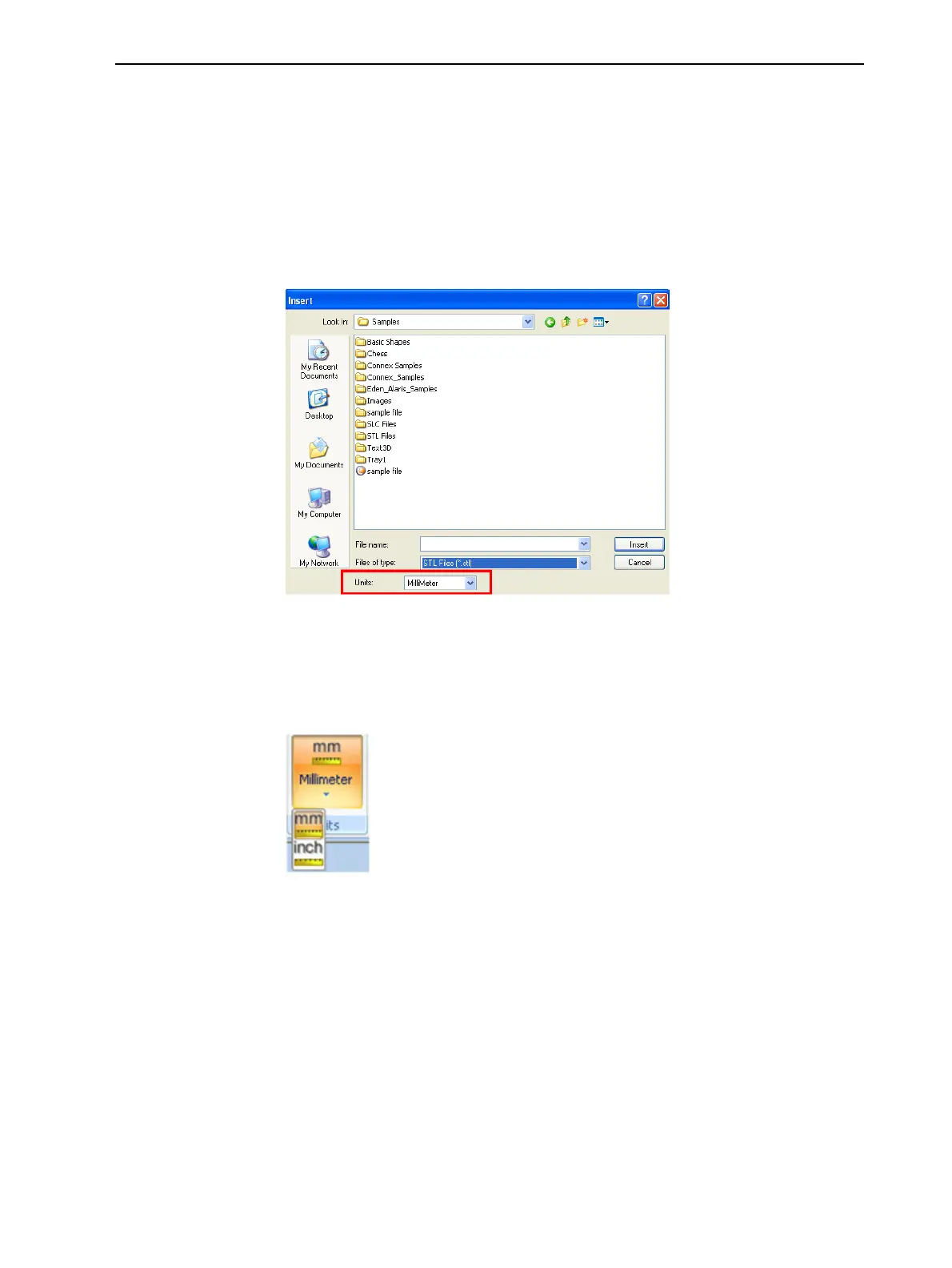 ➢ In the Insert dialog box, Units field, select Millimeter or Inch: